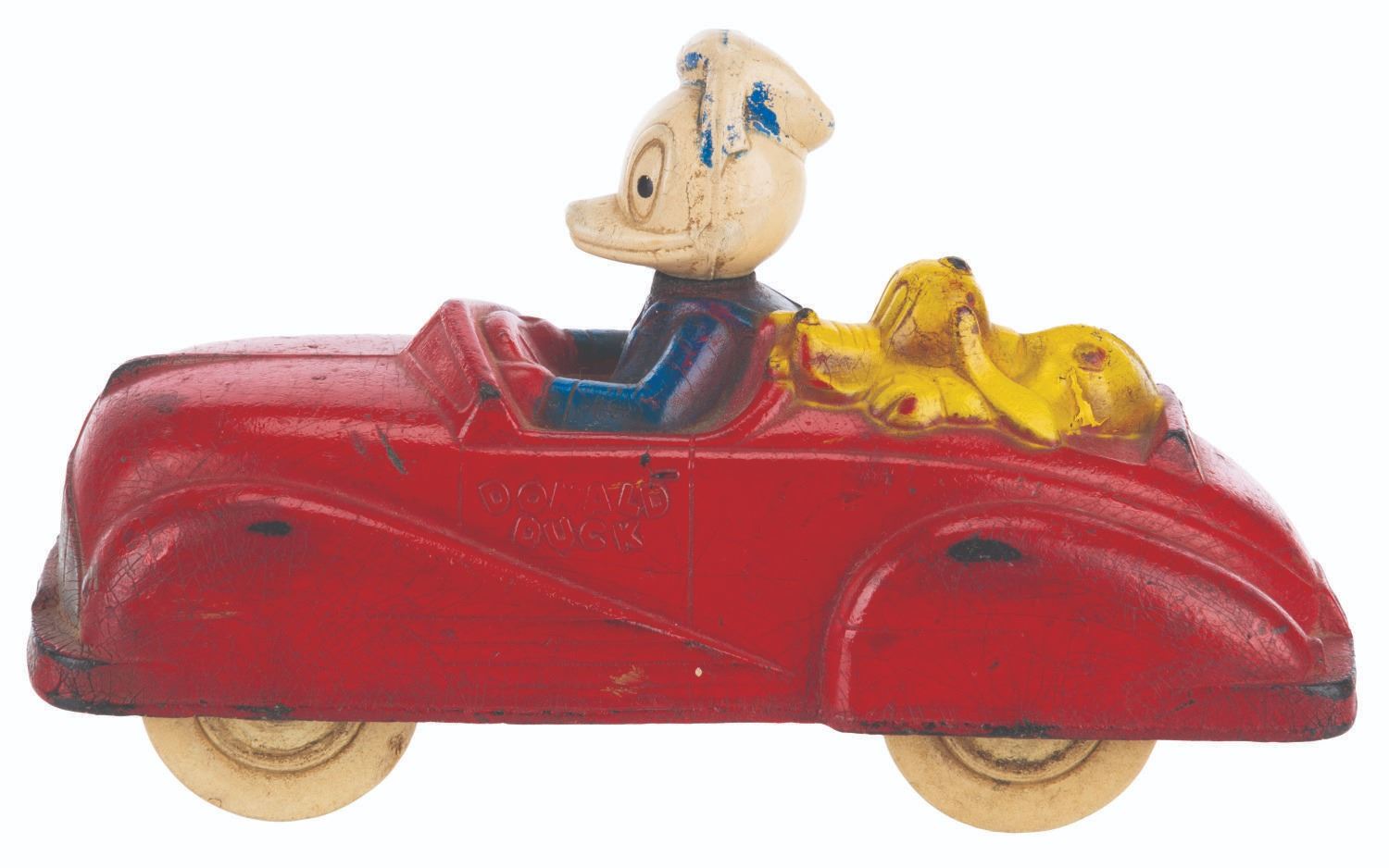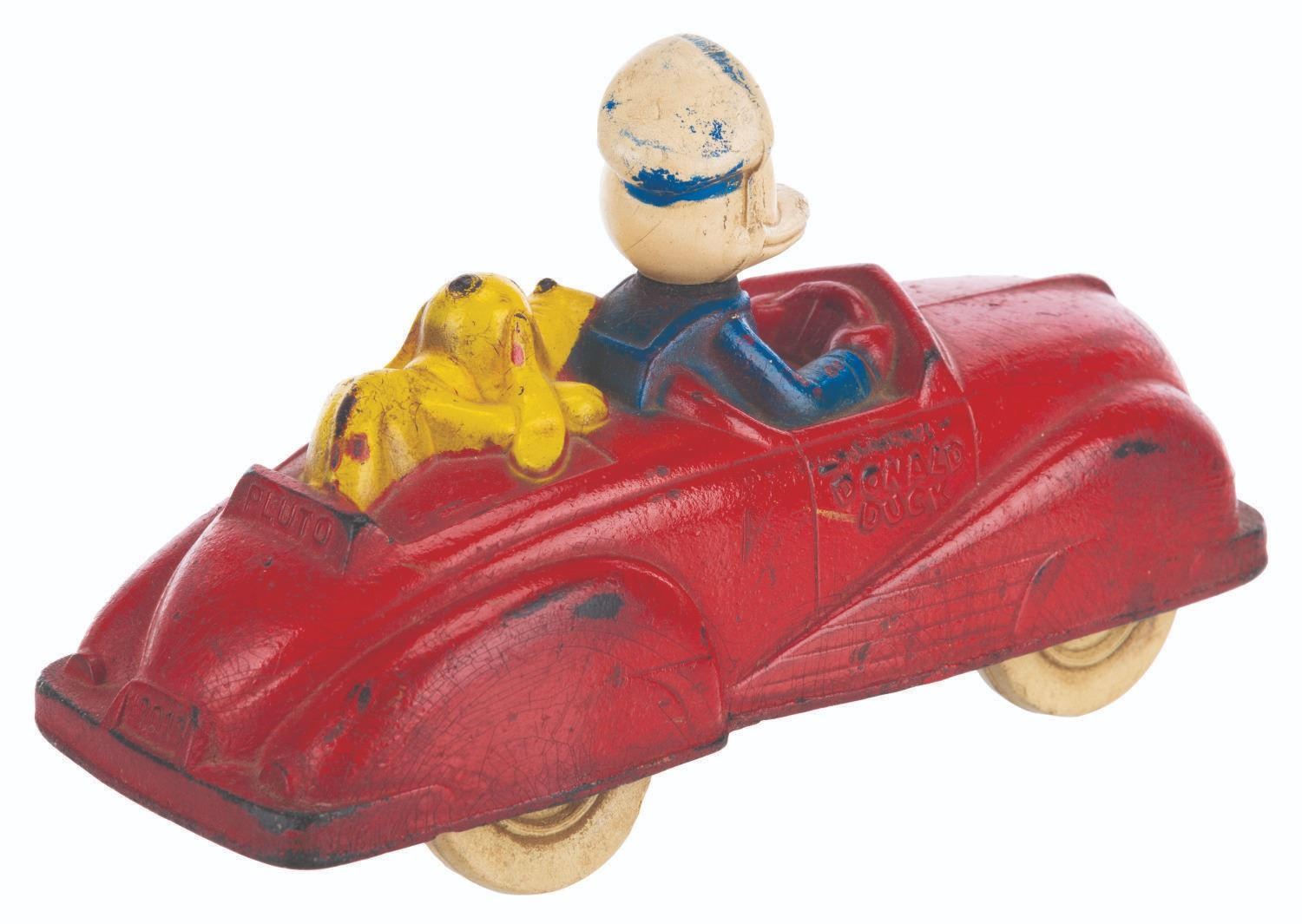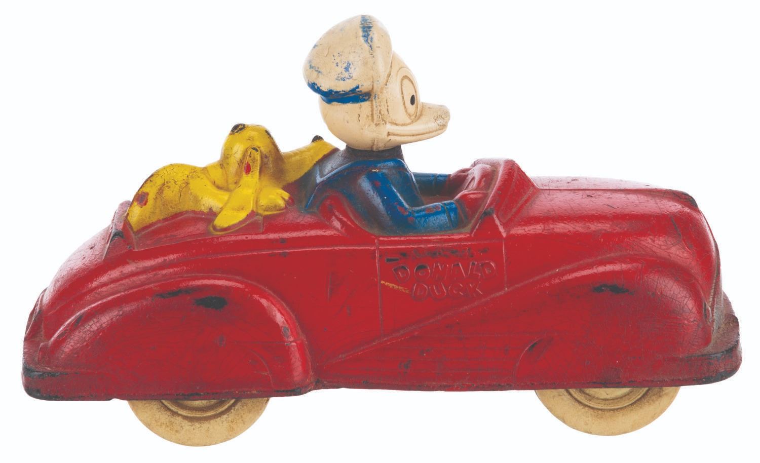 (Viceroy/ Sunroco, 1950s) A Donald & Pluto Disney Wheel Toy composed of Sun Rubber. Measuring 6.5" x 2.5" x 3.5" tall, the toy is in fair condition with paint loss, scuffs, wear, cracks, and scratches throughout.