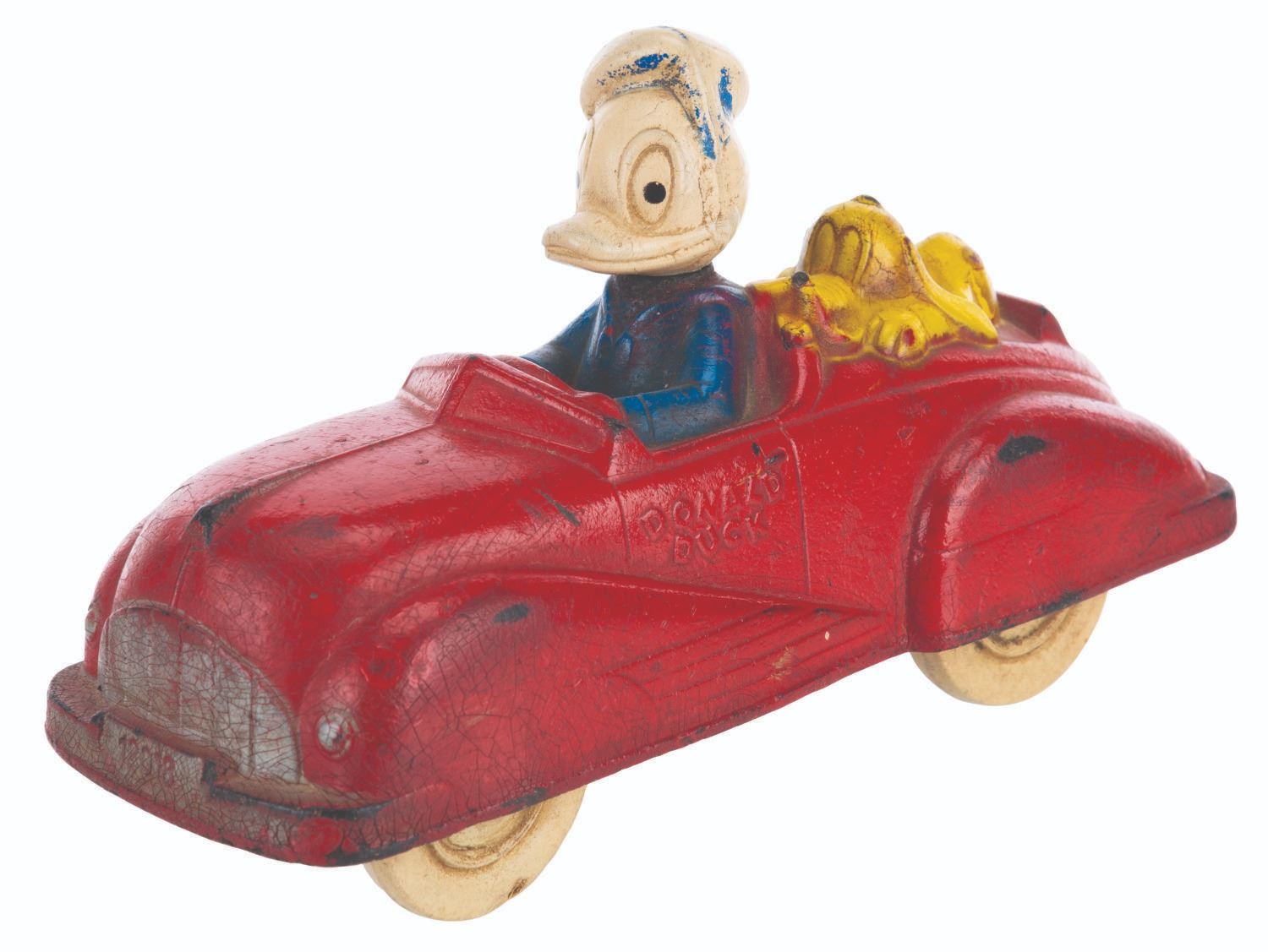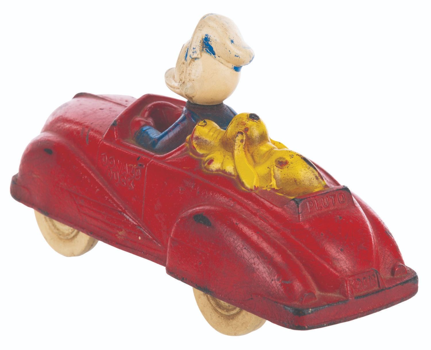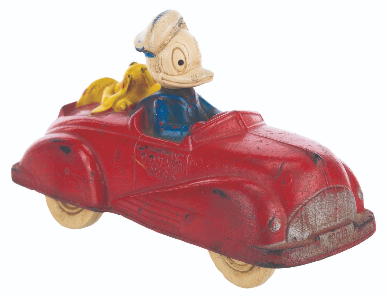 (Viceroy/ Sunroco, 1950s) A Donald & Pluto Disney Wheel Toy composed of Sun Rubber. Measuring 6.5" x 2.5" x 3.5" tall, the toy is in fair condition with paint loss, scuffs, wear, cracks, and scratches throughout.