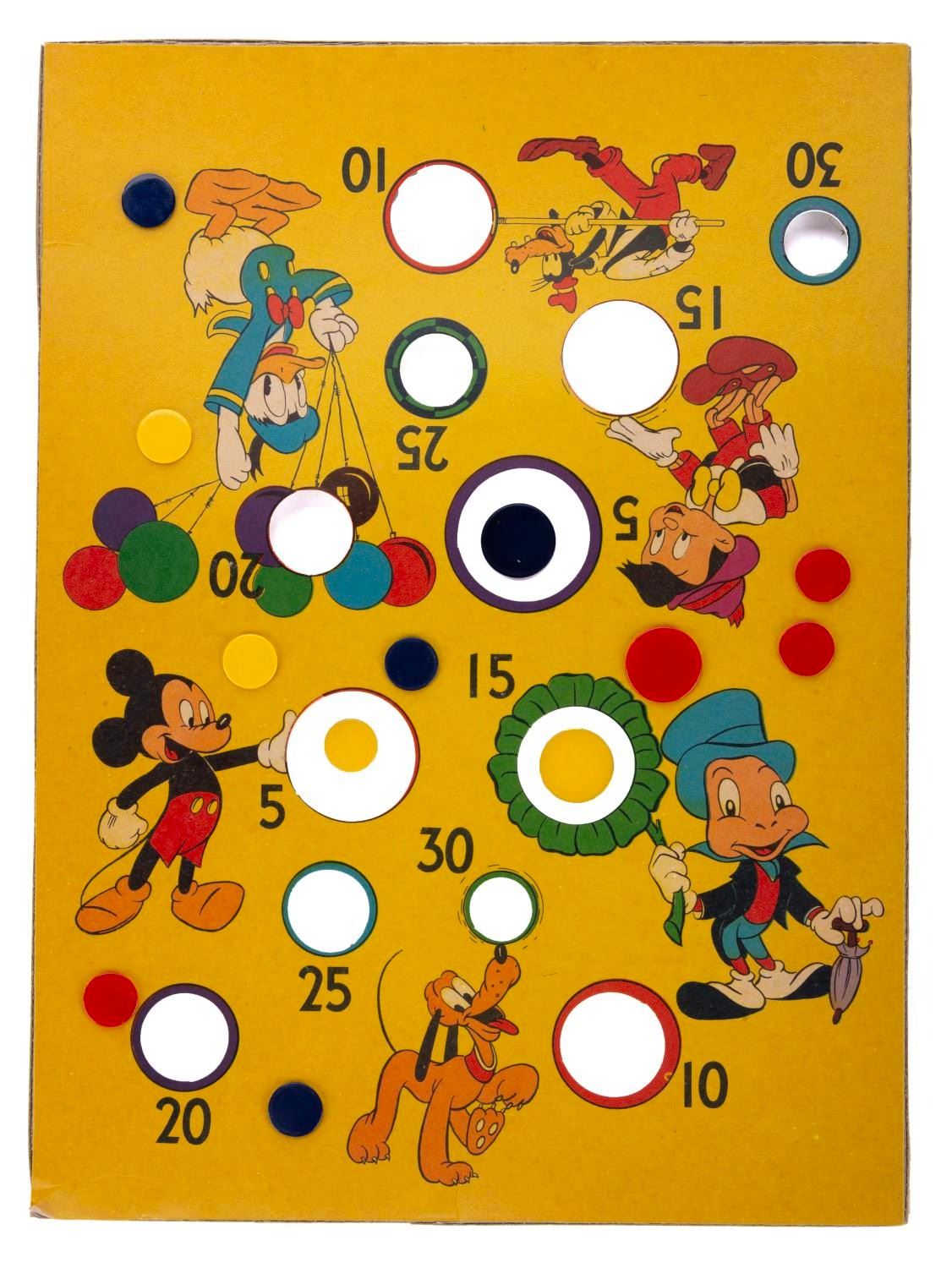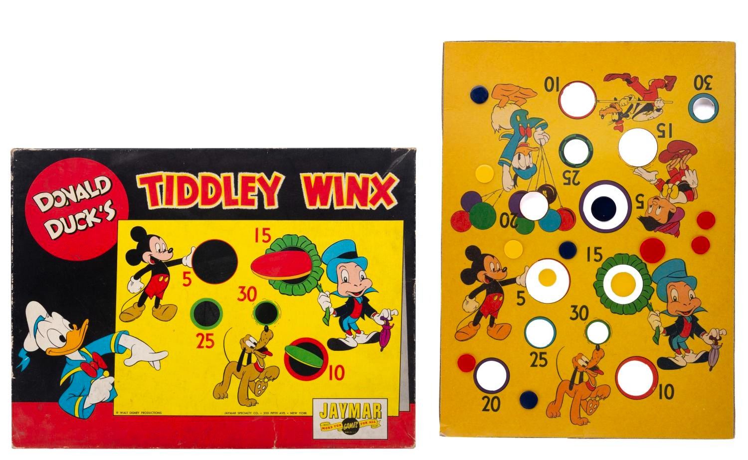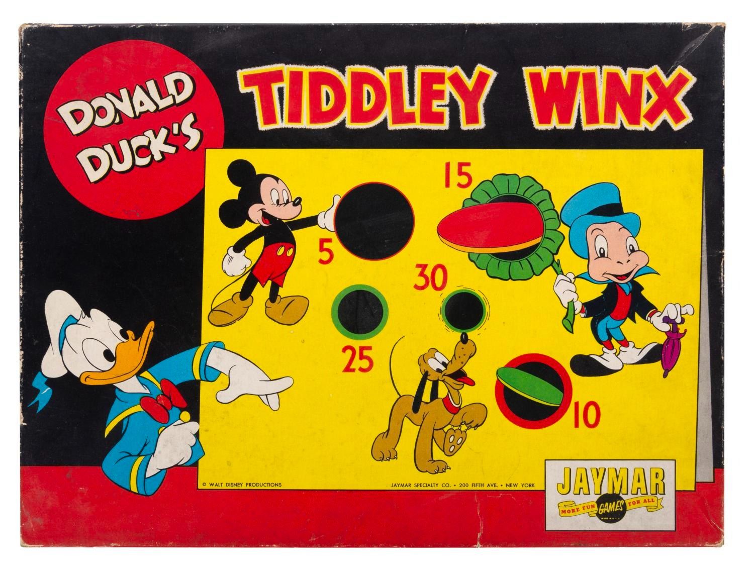 (Jaymar, 1950s) A Donald Duck's Tiddley Winx game featuring a colorful game board with Mickey Mouse, Pinocchio, and Jiminy Cricket. This boxed set is incomplete, missing some of its original Winx, squidger, and felt pieces, but retaining the original board, box, and instructions. The box measures 13.75" x 10.25" x 1", and is in good condition, exhibiting creases, small tears, and wear to its elements and contents.