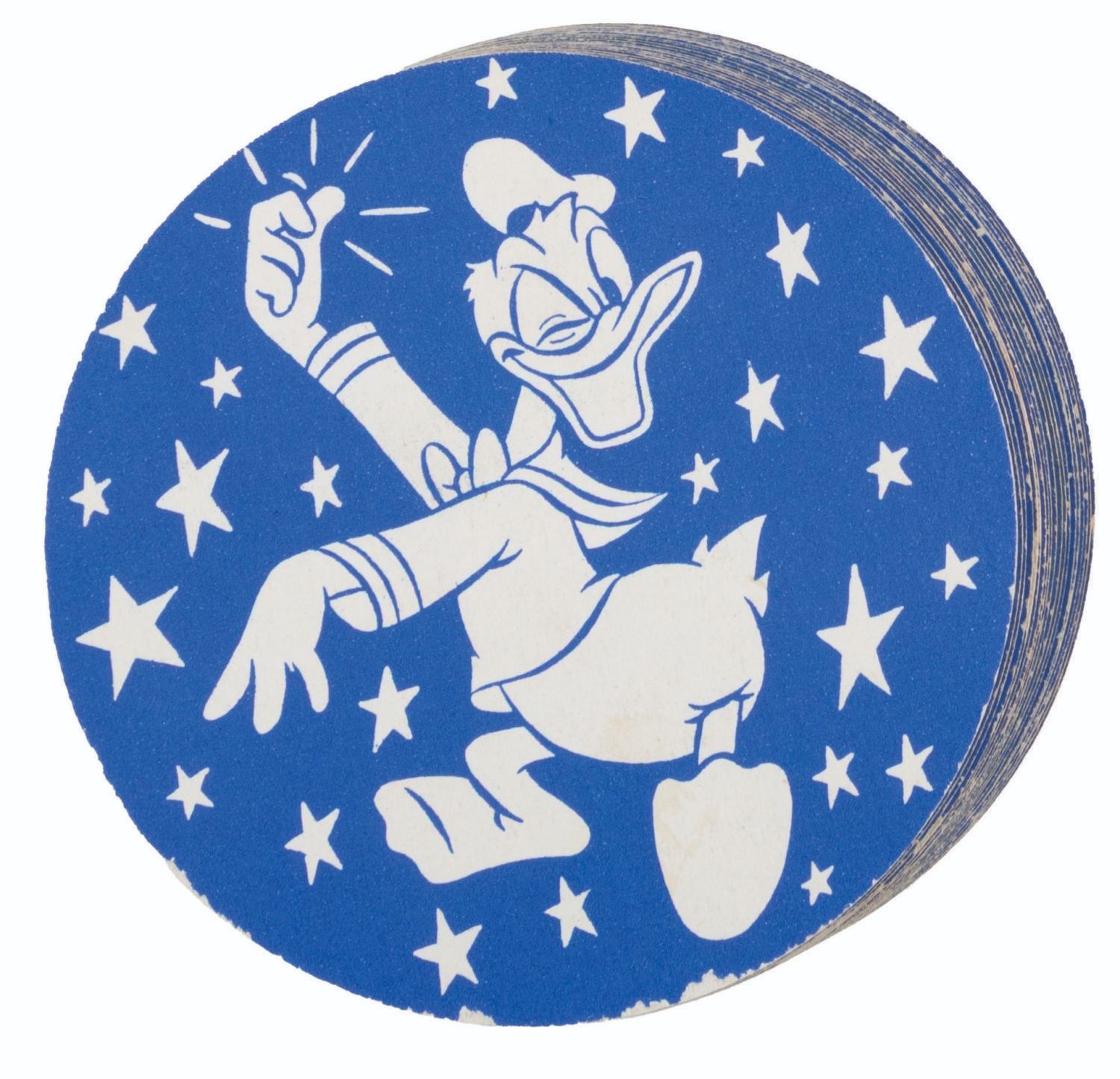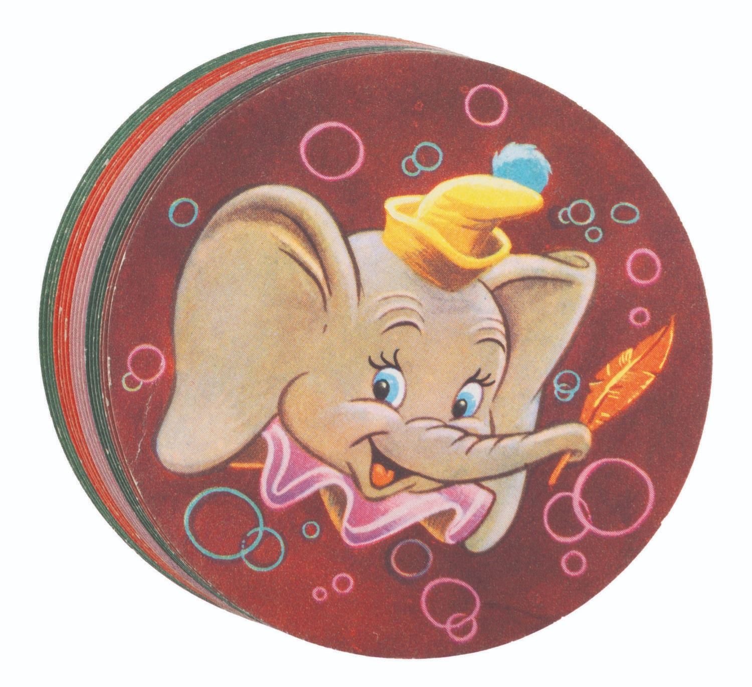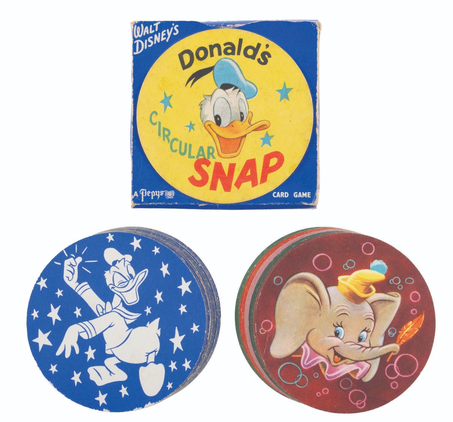 (Pepys, 1951) A Donald’s Circular Snap card game published by Pepys of Britain. The boxed set comes complete with an instruction card and 40 round Disney character cards. The game is in very good condition, with the box in good condition with typical edge and handling wear.