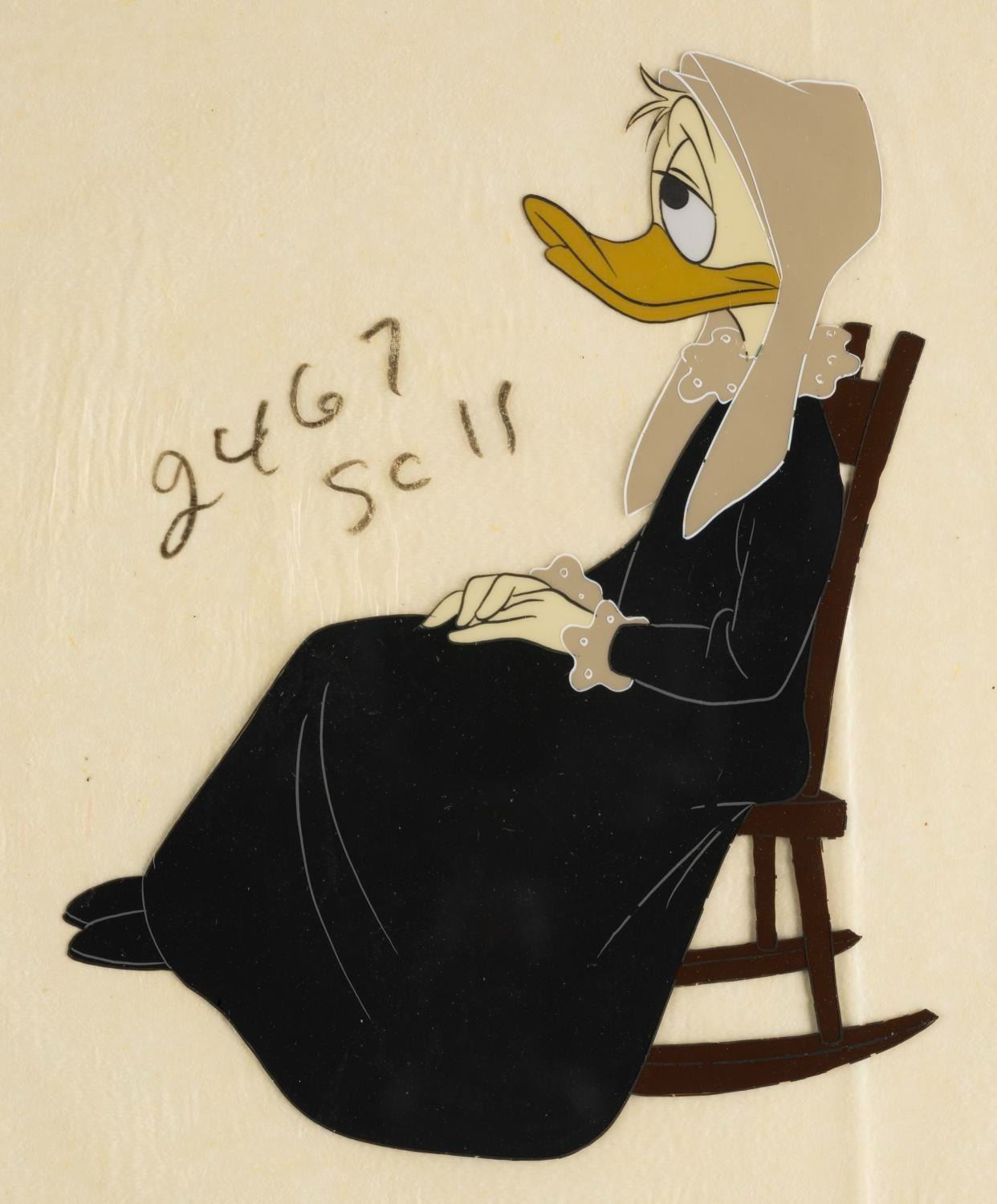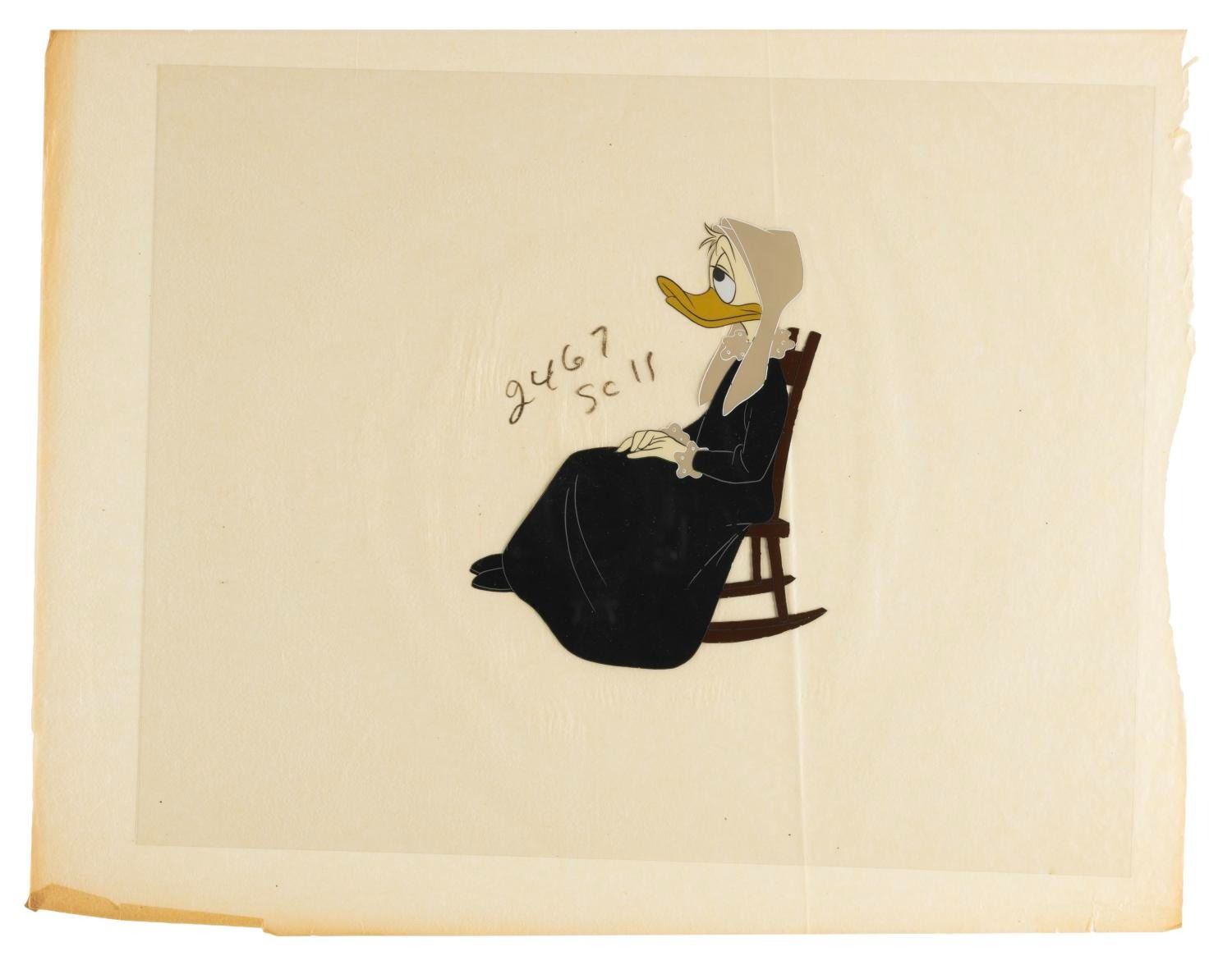 (Disney, 1954) A production cel of Daisy Duck’s mother from the theatrical short “Donald’s Diary.” With a character image size measuring 5.75” x 4.5” on a trimmed 9.5” x 12” cel, the piece is in fine condition.