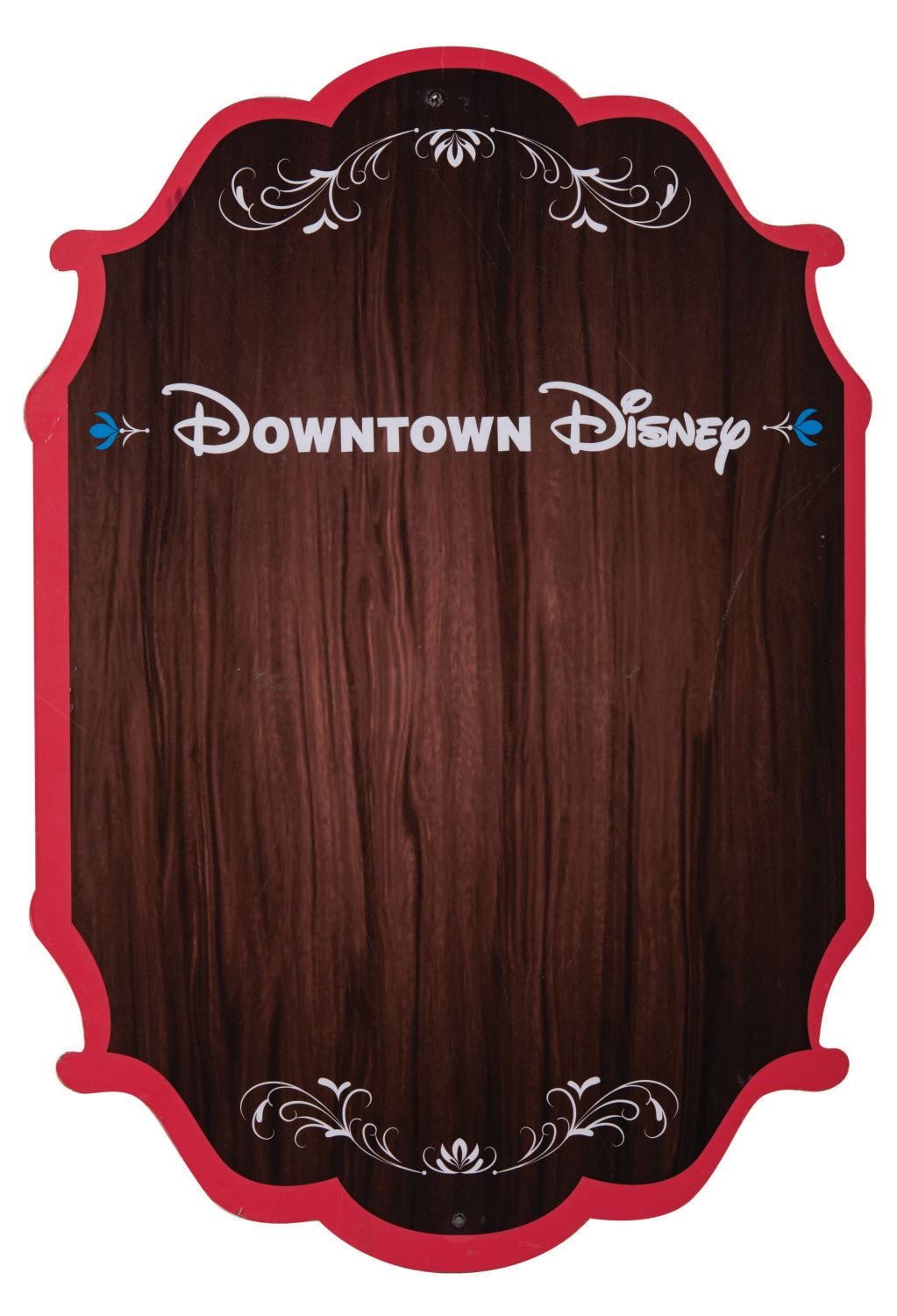 (Downtown Disney, 2014-15) A Downtown Disney sign used near Olaf's Ice Rink. The medium-sized, winter seasonal sign features motif inspired by Arendelle. Measuring 15.25"x22.25", the metal and acrylic sign is in good condition with minor wear to face and hardware holes from original resort display.