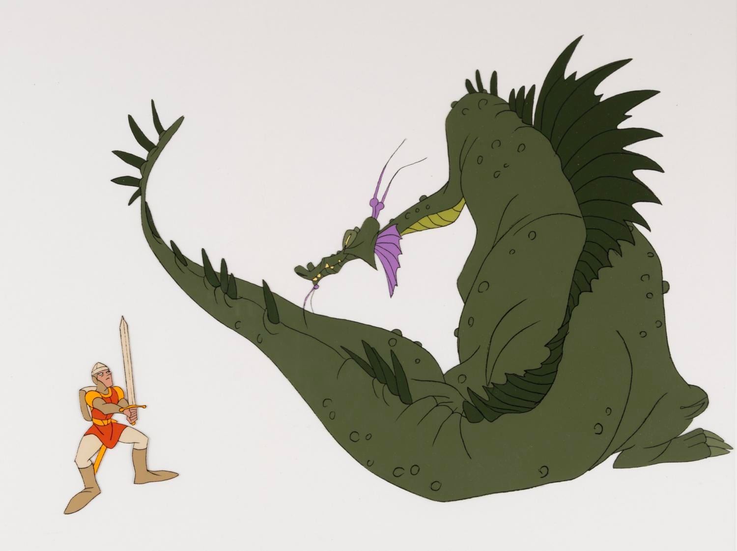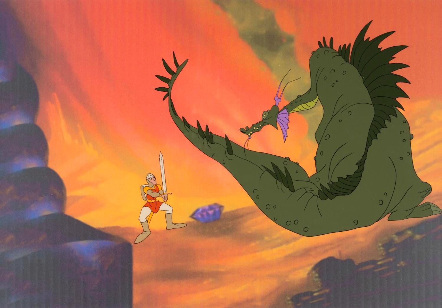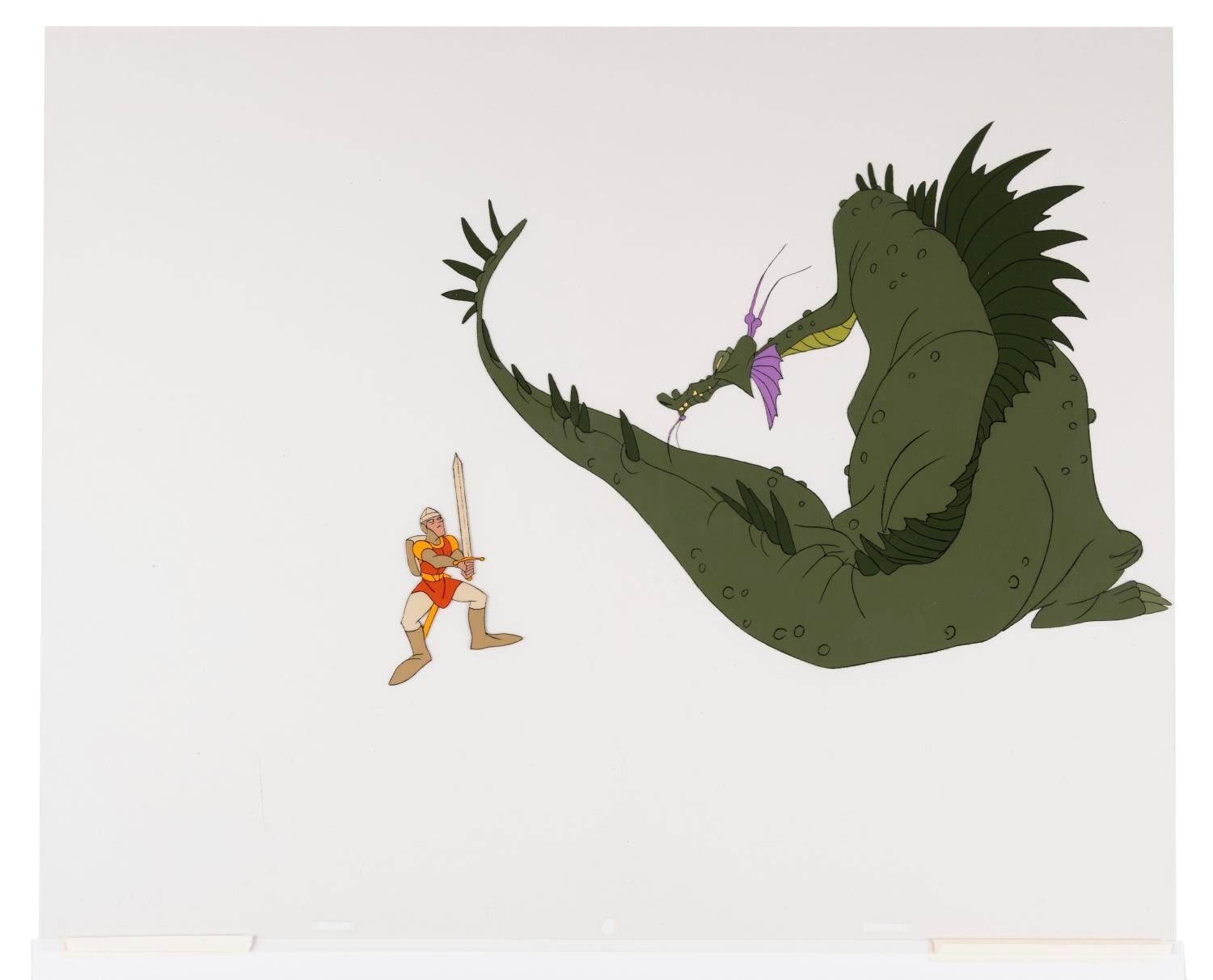 (Bluth, 1983) An original publicity cel of Dirk the Daring and Singe from the Don Bluth Studios cult arcade game Dragon’s Lair. The hand-painted cel has been paired with a color copy background and was created at the studio with the intent of being marketed as a limited edition. Don Bluth's studio was notorious for missing deadlines due to their desire for the highest quality animation possible. This need to focus on the animated films directly conflicted with marketing animation artwork to consumers, so many pieces of this Dragon's Lair limited edition were left unnumbered. With a character image size of 9” x 11.5” on a 13.5” x 16.5” cel, the art is in very good condition with light scratches and wear.