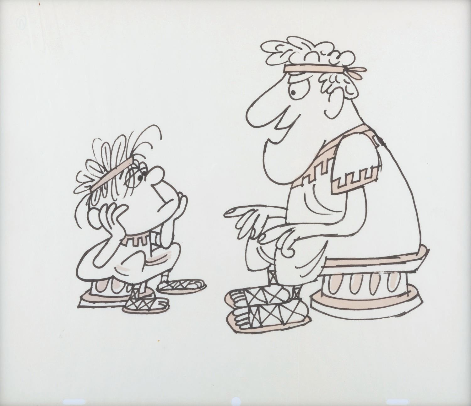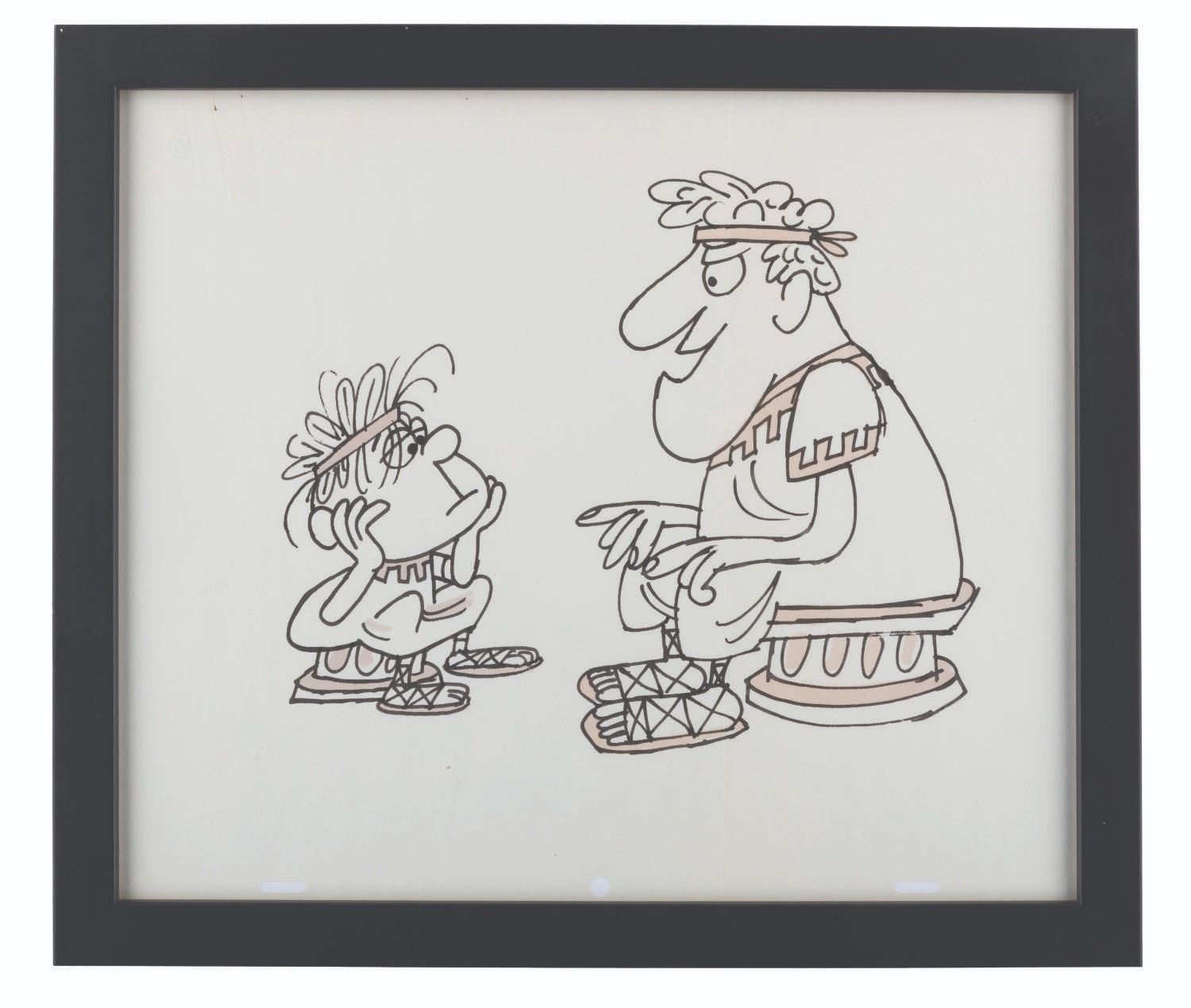 (Ward, 1960s-70s) A drawing of Aesop and Son from their segment of “The Rocky and Bullwinkle Show.” With an image size of 8.75” x 7.5” on 10” x 12” animation paper, the marker drawing is in fine condition.