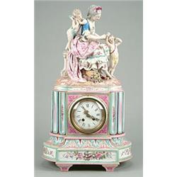 A Dresden (Carl Thieme) porcelain clock, the case surmounted with a figure of a maiden wearing eighteenth century dress attended by two putti, the lower section modelled as the fluted base of a column and set with a French two-train movement striking on a bell, the enamelled dial with Roman numerals, 59cm high, cross 'T' mark, late 19th century (repair to dial, other small areas of damage)