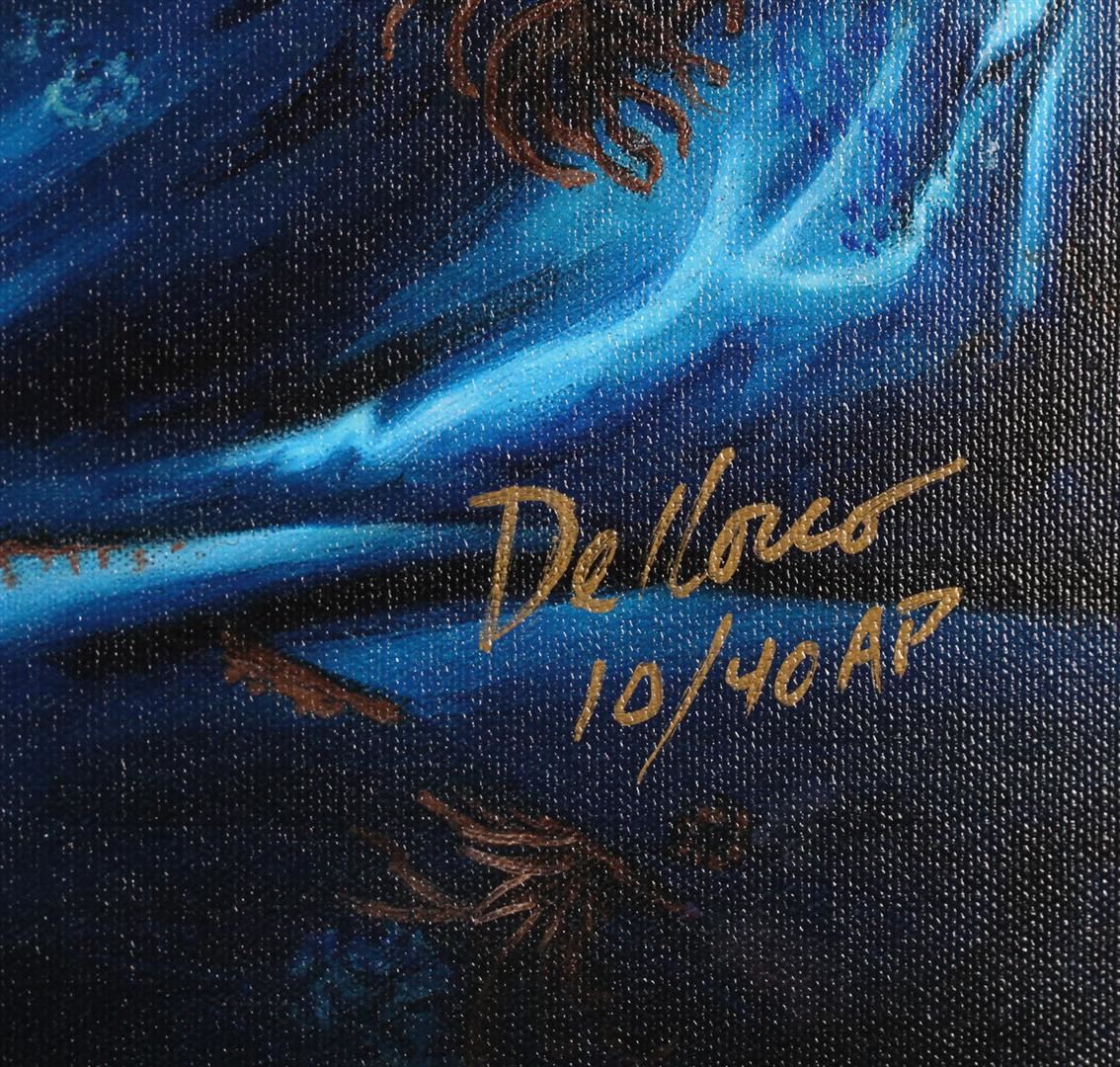 A Drifting Memory: A golden feather symbolically floats to the ground , as the beautiful subject of this limited edition giclee on canvas turns her attention to the future and lets go of her past . The frame is a beautiful gold leaf with a scarlet silken liner . Chris DELLORCO is a well known Disney artist. Limited Edition S/N Giclee on Canvas # AP 10/40.