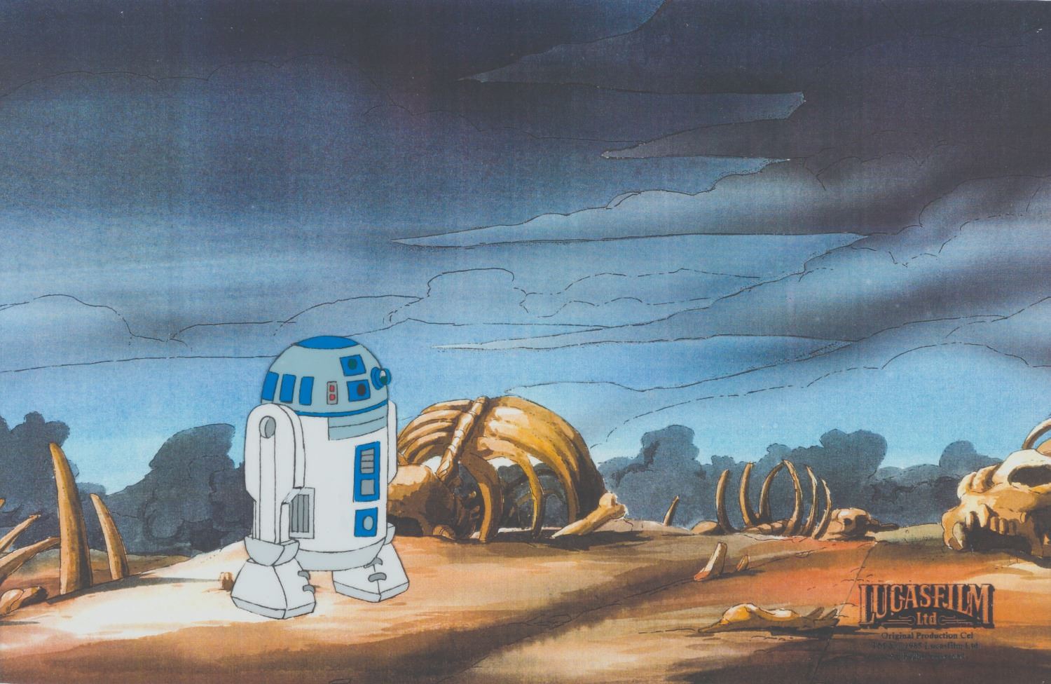 (Nelvana, 1985-86) An original production cel of R2-D2 from “Droids: The Adventures of R2-D2 and C-3PO.” R2-D2 has an image size of 2” x 3” on a 7.5” x 11.5” visible cel paired with a color copy background. The entire matted framed piece measures 15.5” x 19.5”. The artwork is in fine condition with light scuffs to the frame.