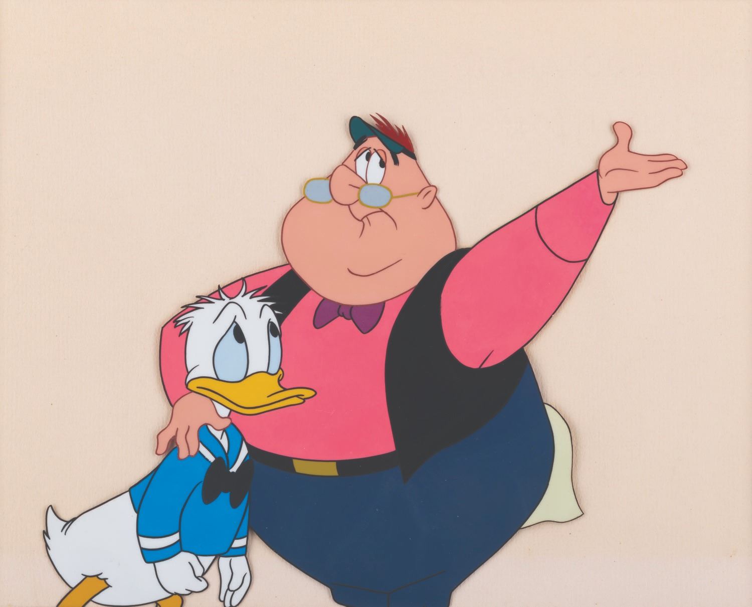 (Disney, 1957) An original production cel of Donald and J. Audubon Woodlore from the "Disneyland" series episode "Duck for Hire," which aired October 23, 1957. This cel was sold at the Disneyland Art Corner, and comes with the original Art Corner gold label on the reverse of the matte. Donald and Woodlore have an image size of 6.5" x 8.5" on an 8" x 10" visible cel. The entire matted piece measures 11" x 14". The cel displays in fine condition with light warping from age.