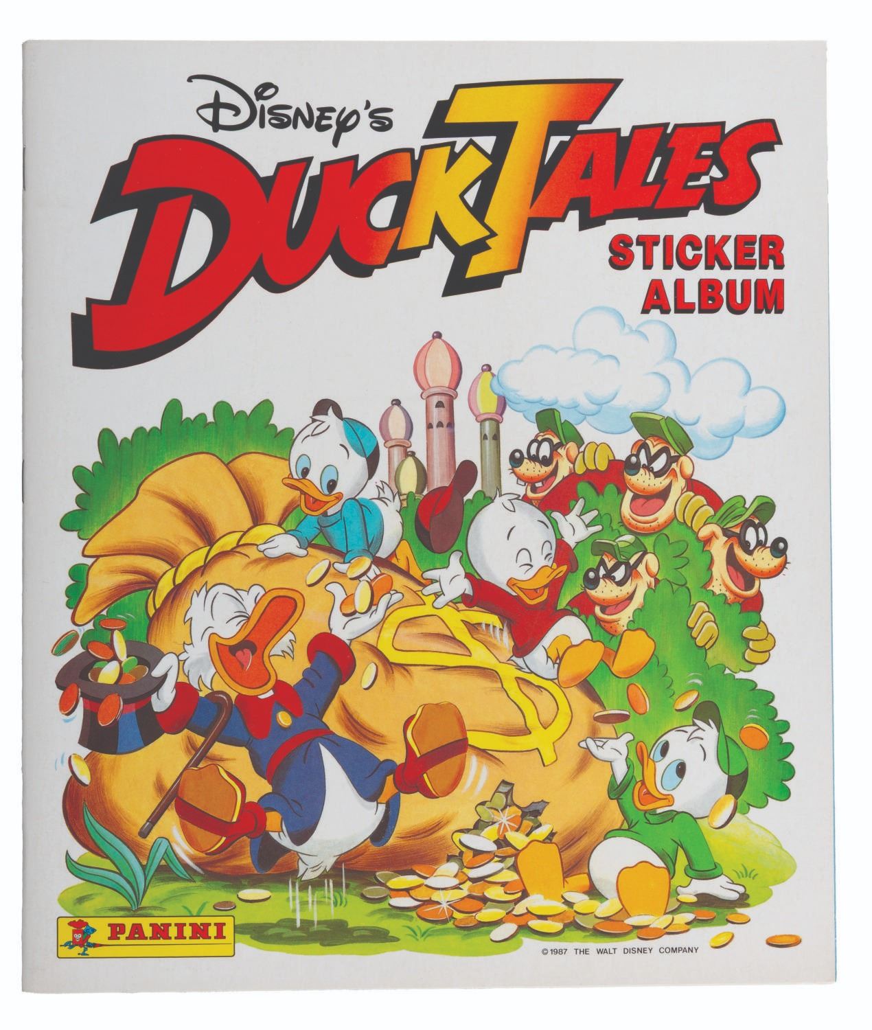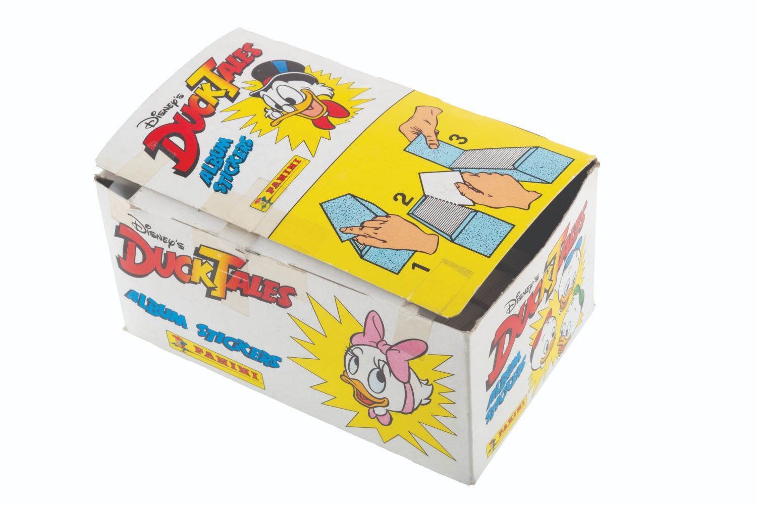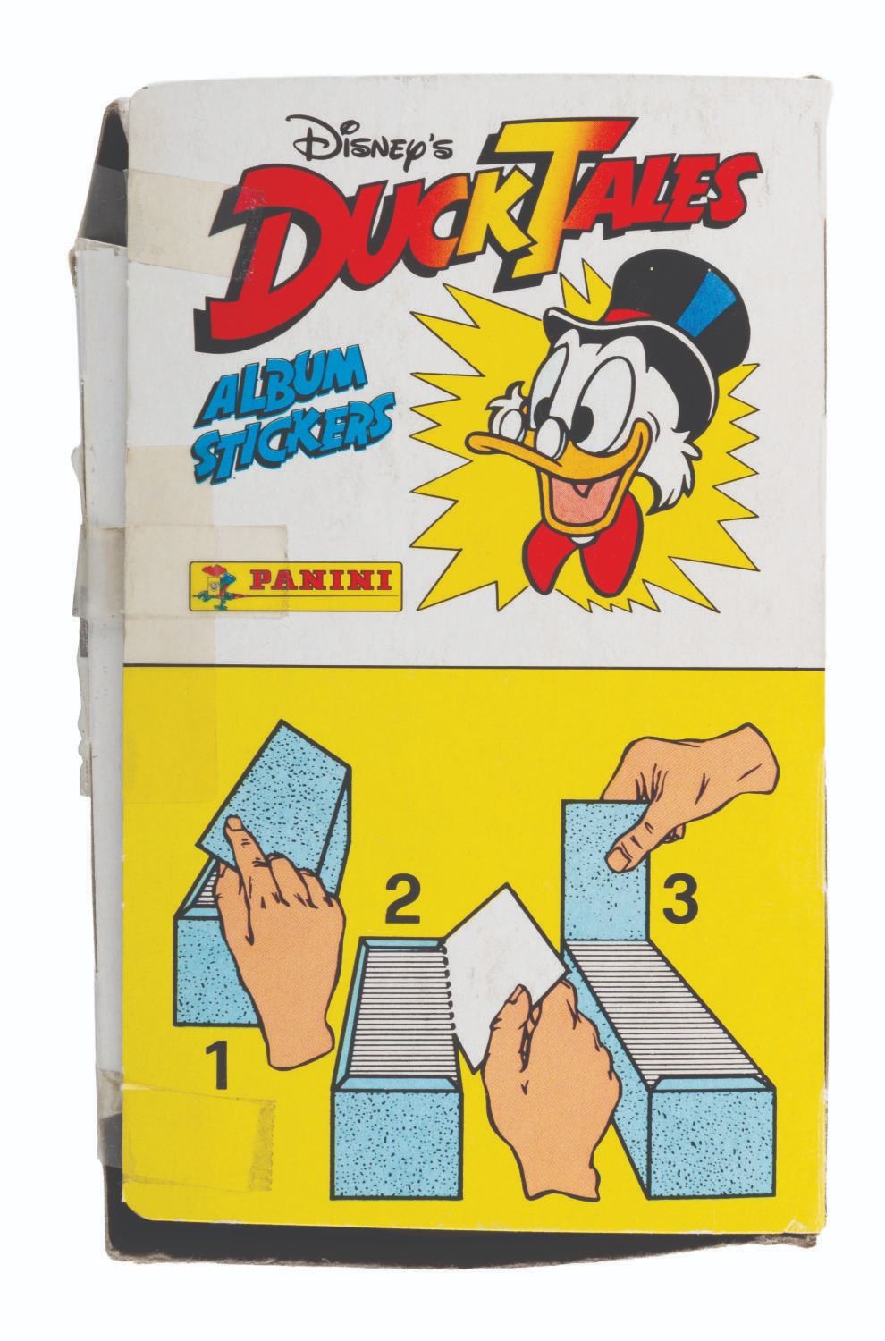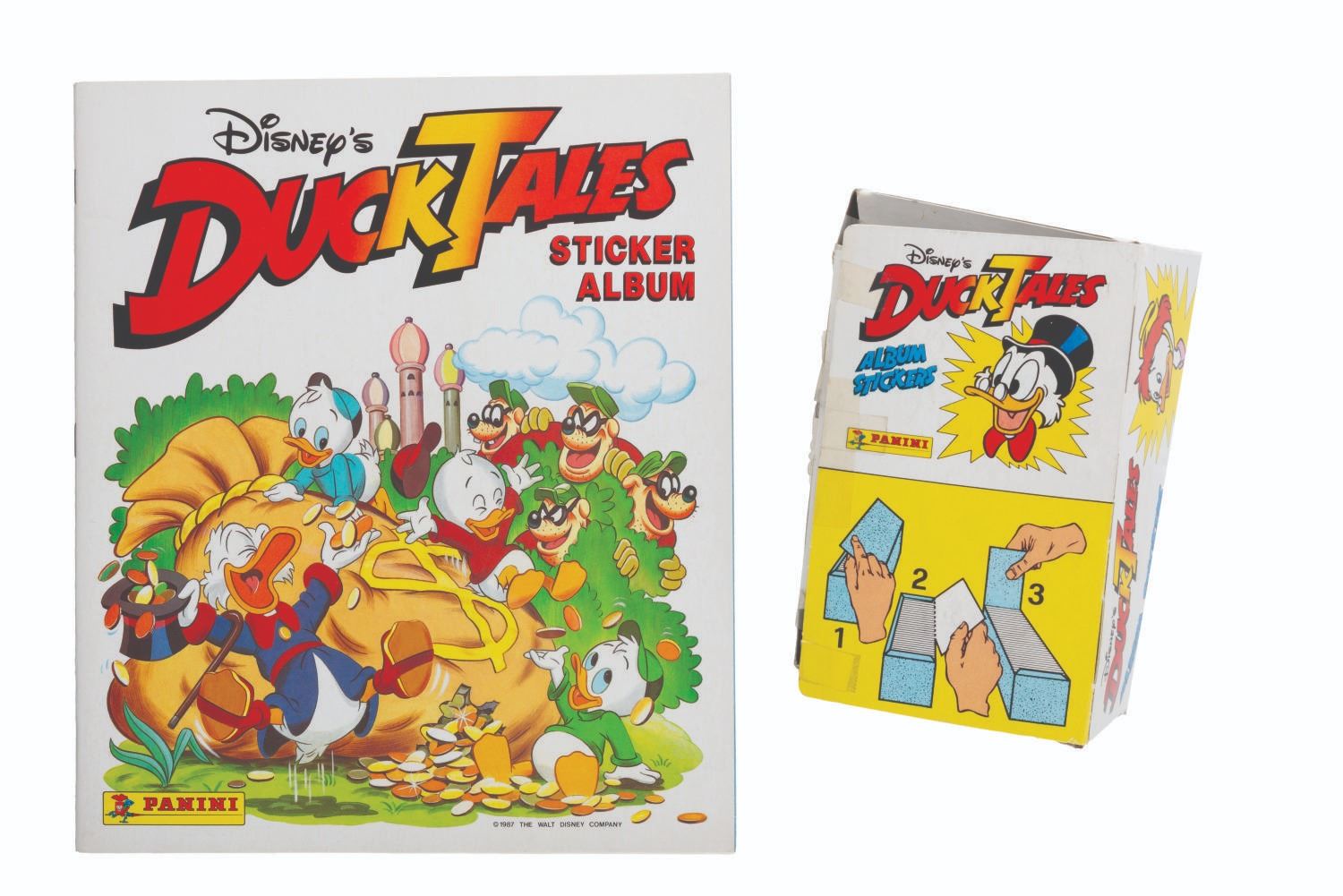 (Panini, 1987) A "DuckTales" Panini sticker book with 1200 stickers and the store display box. The stickers are confirmed to include at least one complete set of the 240 different stickers needed to fill the unused album. The stickers and album are in very good condition, with the box in good condition with tape and handling wear.