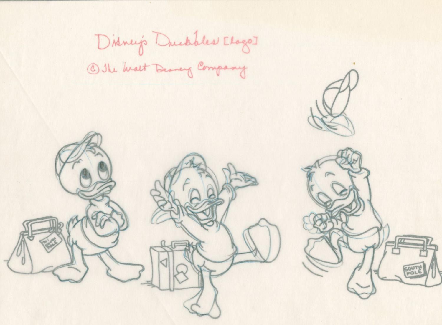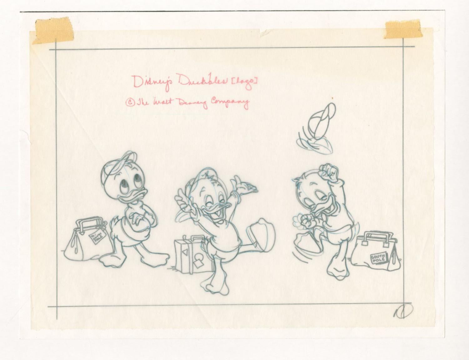 (Disney, 1980s-90s) A development drawing and two photocopies for a View-Master slide of "DuckTales." The graphite drawing and photocopies were created at the Studio and used to create a color image on a View-Master reel. Ranging in size from 7.25" x 10.25" to 8.5" x 11", the development artwork is in very good condition with light edge wear, a tiny tear on the upper edge, and adhesive tape holding the two pieces together.