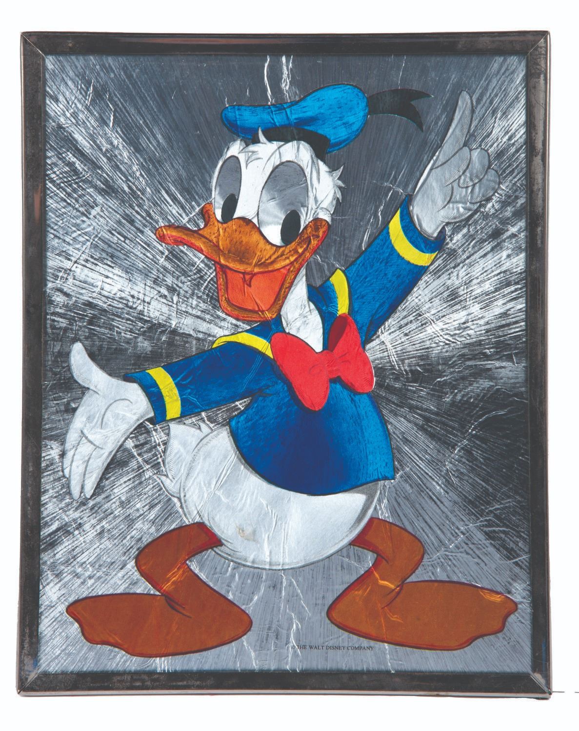 (Disney, 1980s) A Dufex foil print of Walt Disney's Donald Duck. Many Disney characters were produced with this process and were once available as souvenirs of Disneyland and Walt Disney World. Measuring approximately 10" x 8", the print is in fair condition, exhibiting much creasing and wear throughout.