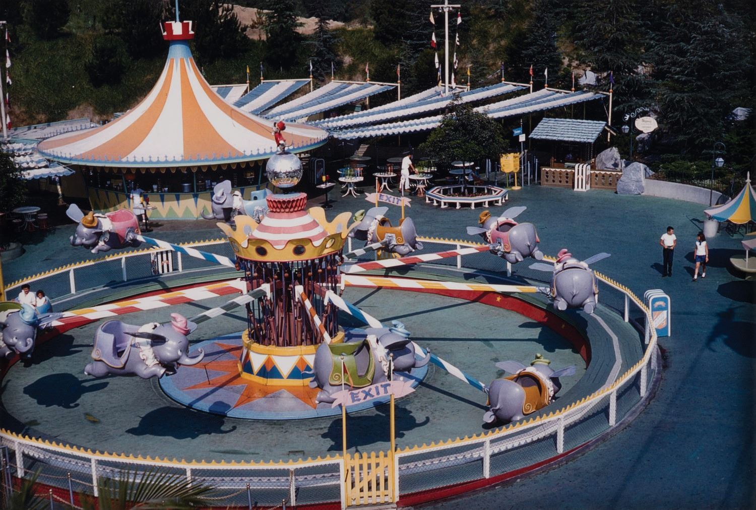 (Disneyland, 1980s-90s) A decorative oversized vintage 1960s photograph of Dumbo Flying Elephants once hung in a Backstage Area of Disneyland. Measuring 29.75"x20", the large photo print is in very good condition in original frame with minor wear throughout from age.