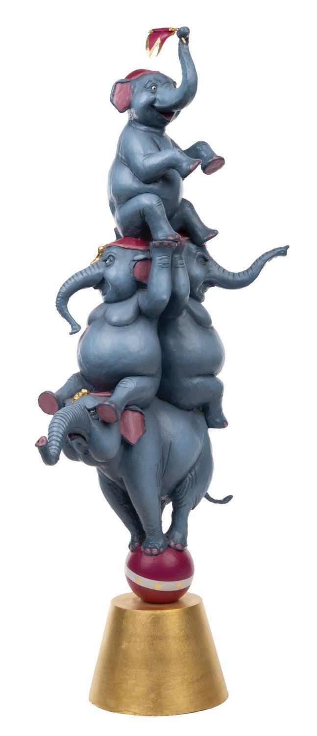 (Disneyland, 1982) A "Pyramid of Pachyderms" figural lamppost topper from Disneyland. Several of these sculptures circle the Dumbo Flying Elephants attraction at Disneyland. This piece, with its delicate and intricate lifelike paint design, was removed before the 50th anniversary of the Park in 2005, after which all these have been painted solid gold. Measuring 13.5"x8.5"x28.5" tall, the piece displays in very good Park-used condition, with the very top elephant's trunk repaired but leaving the flag slightly bent.
