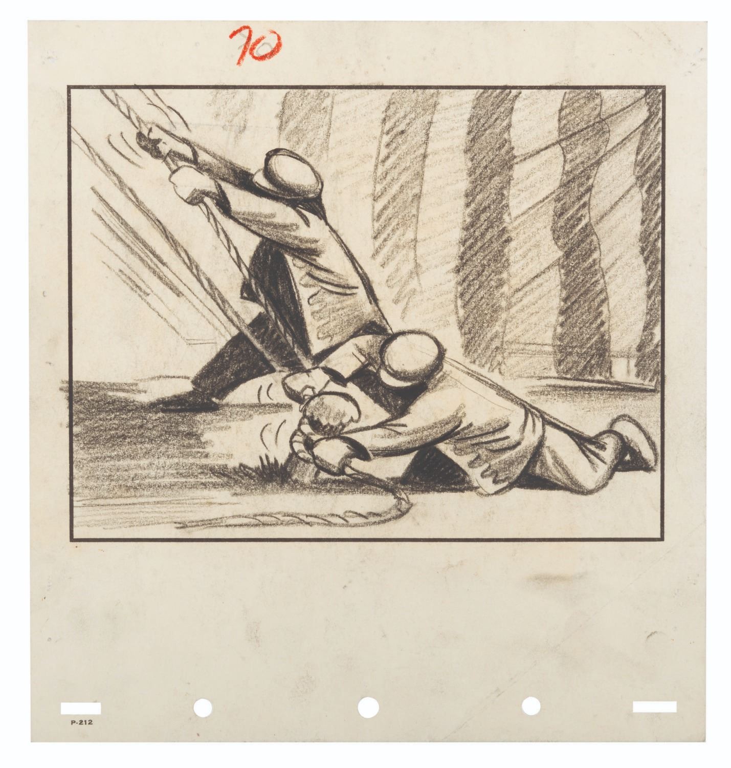 (Disney, 1941) An original storyboard panel featuring circus workers from Disney's "Dumbo." Accomplished in graphite and colored pencil, the entire panel measures 8.25" x 8.75". The artwork is in good condition with expected smudges, pinholes, creases, and wear from production.
