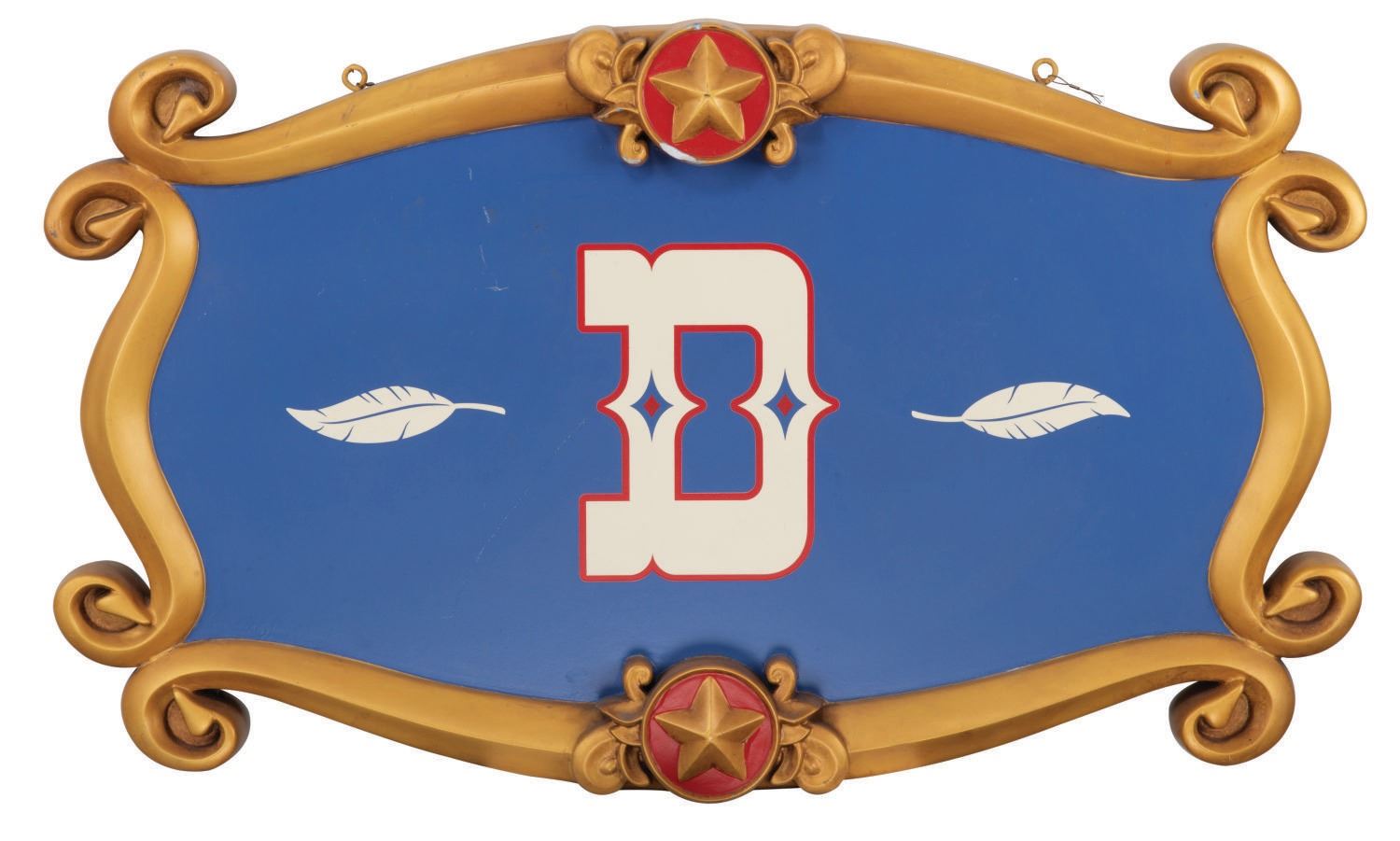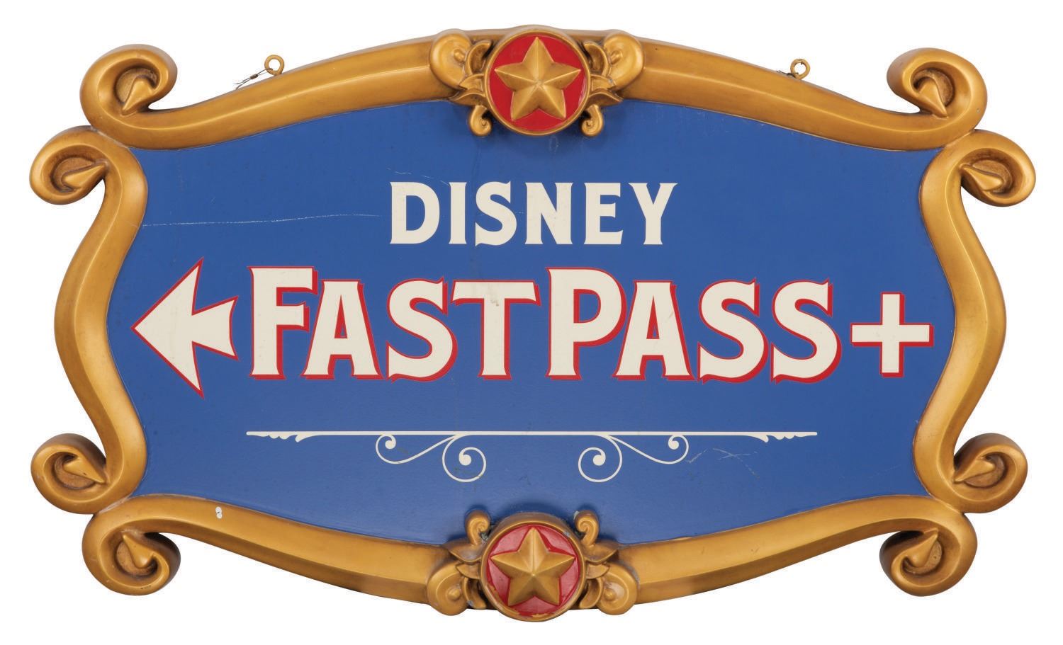 (Walt Disney World, 2010s) A Dumbo the Flying Elephant Fast Pass sign from The Magic Kingdom at Walt Disney World. Measuring 21"x35" and 5" deep, the metallic sign with painted letters displays in good condition, with a few large scuffs and wear from park use.