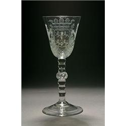 A Dutch-engraved light-baluster goblet, the round funnel bowl engraved with arms of four lions rampant beneath a coronet and flanked by lion supporters, supported on a bobbin-knopped stem, the central knop filled with bead inclusions, on a conical foot, 19cm high, circa 1750 (minute foot rim chip) (see illustration) Exhibited: Strange and Rare, 50th Anniversary of The Glass Circle at Broadfield House Glass Museum September 1987, No. 41 and thence to The Pilkington Glass Musuem, St. Helens, Lancs. £2,000-3,000