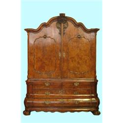A Dutch figured walnut 'Amsterdam' cabinet circa 1800, having arched foliate-carved and shaped cornice over a pair of conforming panelled doors, enclosing a pair of drawers over bombe base fitted 2 short and 2 graduated long drawers, flanked by a pair of secret cupboards each enclosing 4 drawers, raised on massive ball and claw feet, height 8ft 4ins, width 6' 6ins. 2000-3000
