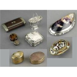 A Dutch silver miniature coal scuttle, with two folding lids beneath a cable moulded loop handle, embossed with putti on a see-saw, foliate borders, 2.75in over handle, B. H. Joseph, import marks, London 1891; a continental silver coloured metal shaped square box, engraved with leaf scrolls, wrigglework border, 2.25in, 19th century; a white metal mounted hardwood snuff box, inlaid with anchor and inscribed 'La Jurassienne', 3.5in wide, early 19th century; four further boxes (7)