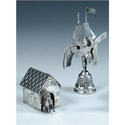 A Dutch silver miniature model of a windmill raised on a figural bell based pedestal, import marked for Sheffield 1899, 8.25cm and another Dutch miniature modelled as a dog outside a kennel, import marked for Sheffield 1899, 4.25cm wide (2) £70-100