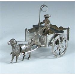 A Dutch silver miniature modelled as a dog cart, the driver with a tricorn hat and a whip, import m.