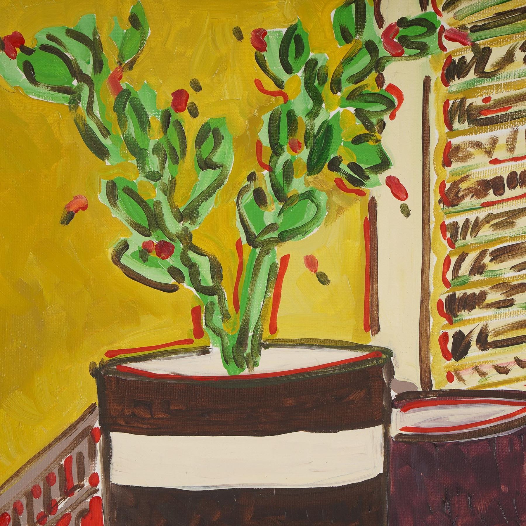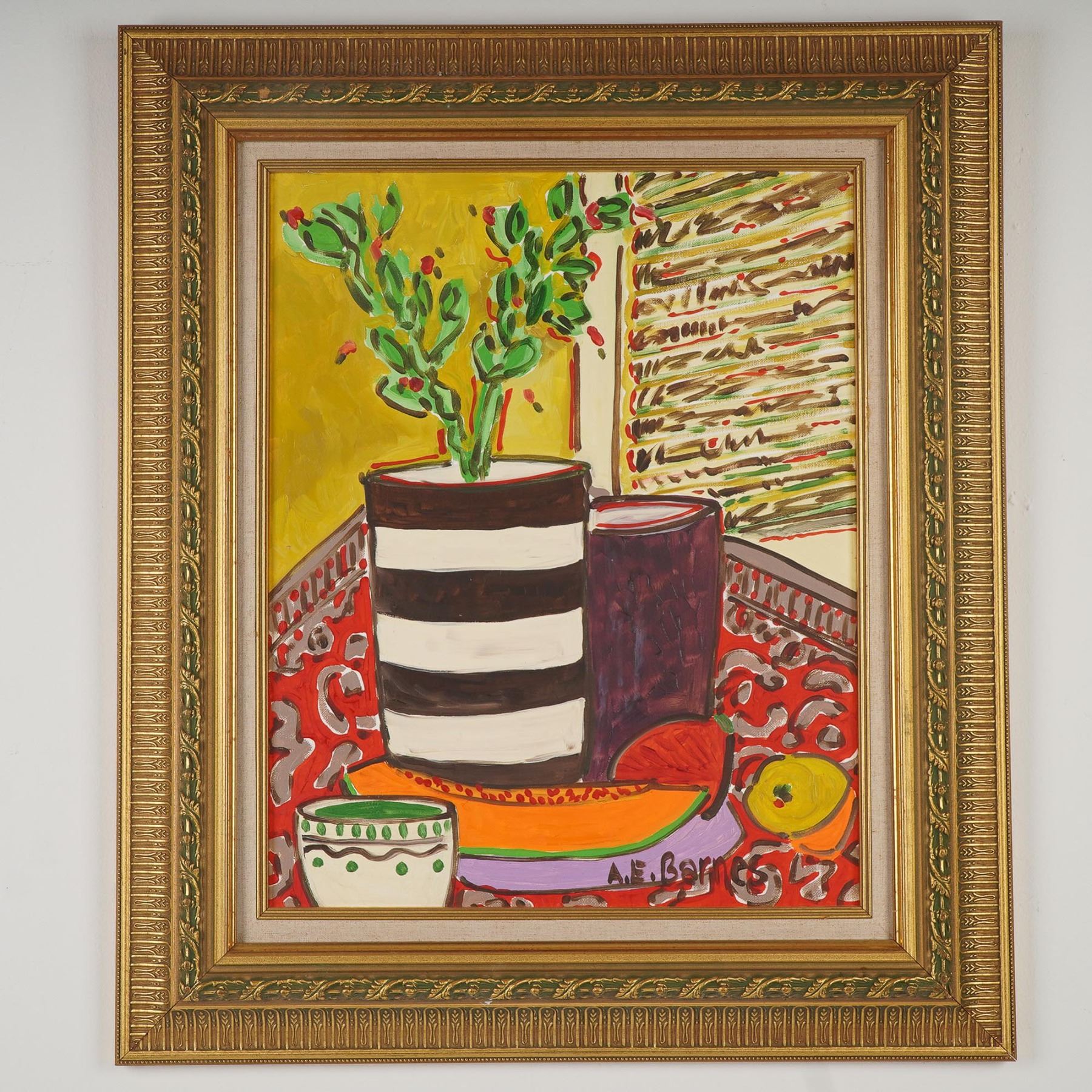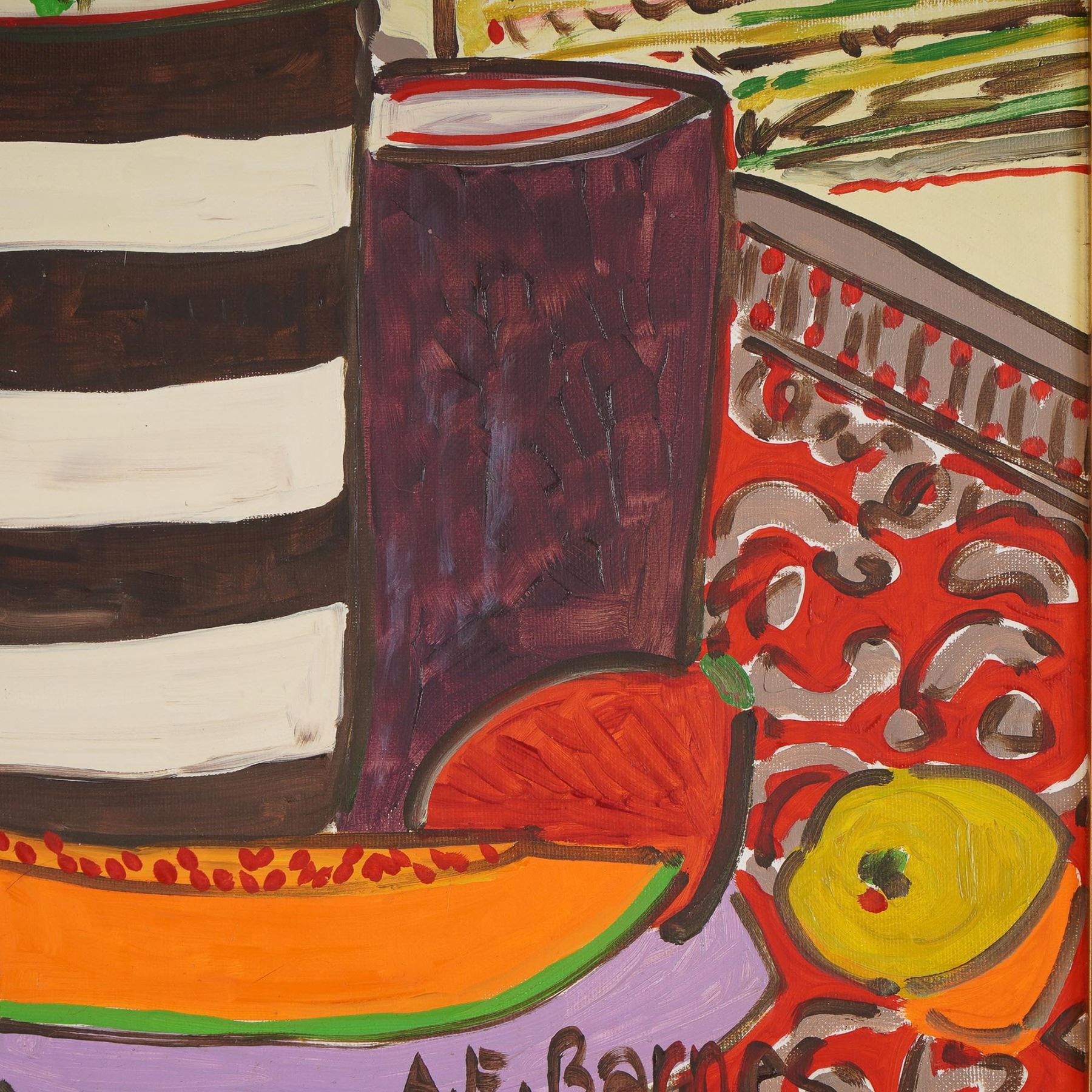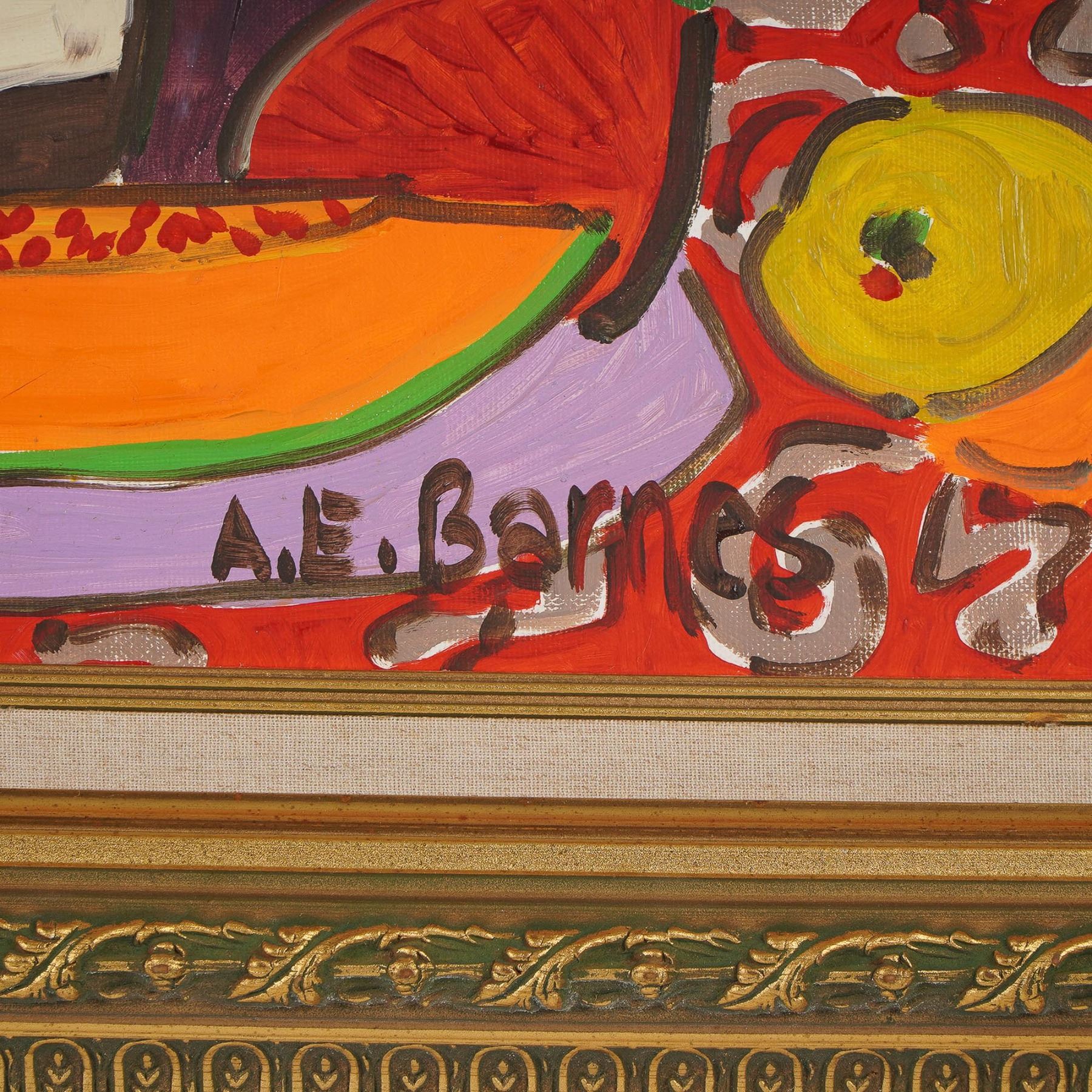 A vibrant original painting signed by A.E. Barnes, presented in an ornate carved gold and green frame. This colorful still life composition features a striped vase with green foliage, a deep red cup, a cut melon, a yellow apple, and a decorative bowl, all set against a bold patterned red table covering and abstract yellow and green background. The artist's expressive brushwork and saturated palette evoke a lively, energetic atmosphere. Signed lower right A.E. Barnes. Framed and ready for hanging with wire on verso.