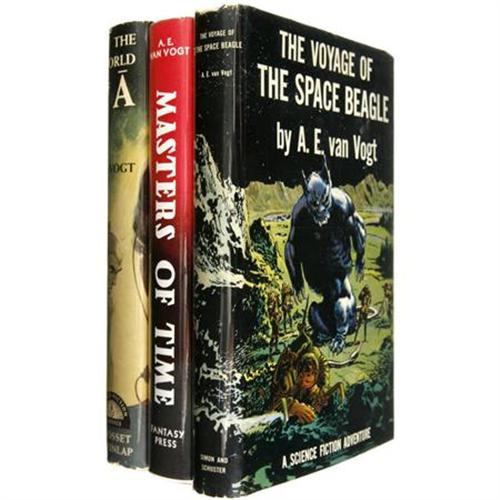 <B>A. E. van Vogt: Lot of Three Books.</B></I> Includes the following:<BR><B><I>The Voyage of the Space Beagle.</B></I></B></I> (New York: Simon and Schuster, 1950), first edition, 240 pages, black boards, 12mo, dust jacket clipped. Condition (book/ dj): very good/ very good.<BR><B><I>Masters of Time.</B></I></B></I> (Reading, PA: Fantasy Press, 1950), first edition, 227 pages, red boards, 12mo, dust jacket. Condition (book/ dj): fine/ fine.<BR><B><I>The World of A.</B></I></B></I> (New York: Grosset & Dunlap, 1950), reprint, 246 pages, green boards, 12mo, dust jacket. Condition (book/ dj): very good/ very good.<BR><BR><b>Shipping:</b> Books & Catalogs (<a target="_blank" href="http://www.heritageauctions.com/common/shipping.php">view shipping information</a>)