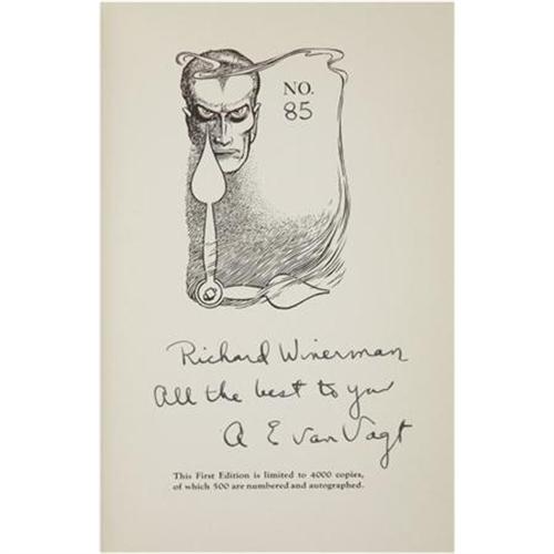 <B>A. E. van Vogt. </B></I><B><I>Masters of Time</B></I></B></I><B>.</B></I> Reading: Fantasy Press, 1950.<BR><BR>First edition limited to 4,000 numbered copies inscribed by the author. Twelvemo. 227 pages. Jacket design and illustrations by Edd Cartier.<BR><BR>Red cloth with gilt titles on the spine, Currey priority A. Slight loss to a portion of the gilt rules at the top of the spine. Internal contents bright with toning at the pastedowns. Beautiful, bright dust jacket. A fine copy. <I>From the Robert and Diane Yaspan Collection.</B></I><BR><BR><b>Shipping:</b> Books & Catalogs (<a target="_blank" href="http://www.heritageauctions.com/common/shipping.php">view shipping information</a>)