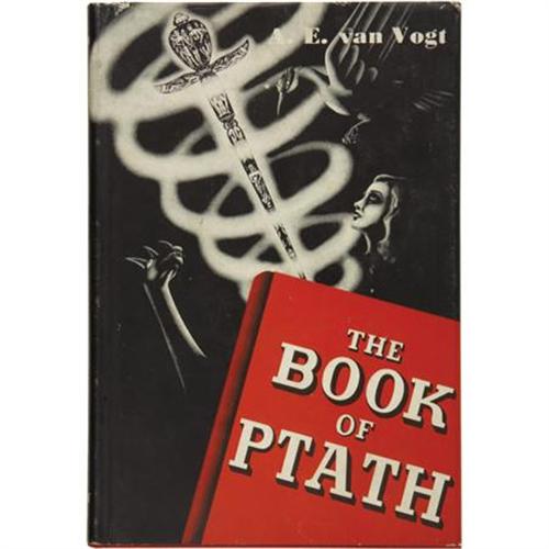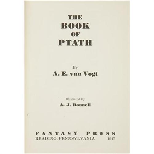 <B>A. E. van Vogt. </B></I><B><I>The Book of Ptath</B></I></B></I><B>.</B></I> Reading: Fantasy Press, 1947.<BR><BR>First edition (Currey priority A). One of 500 numbered copies inscribed by the author on a special limitation page. Jacket and illustrations by A. J. Donnell. Twelvemo. 227 pages.<BR><BR>Original red cloth with gilt titles on the spine. Light shelf wear. Internal contents bright and tight. Dust jacket with light wear at the head and foot of the spine. Back panel slightly soiled from shelf wear. A fine copy. <I>From the Robert and Diane Yaspan Collection.</B></I><BR><BR><b>Shipping:</b> Books & Catalogs (<a target="_blank" href="http://www.heritageauctions.com/common/shipping.php">view shipping information</a>)