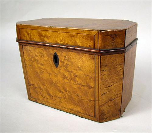 A ENGLISH BURLED WOOD HEXAGONAL INLAID TEA CADDY, keyhole escutcheon, missing interior, 19th c., 5-1/4" x 7-1/2" x 4-1/4"