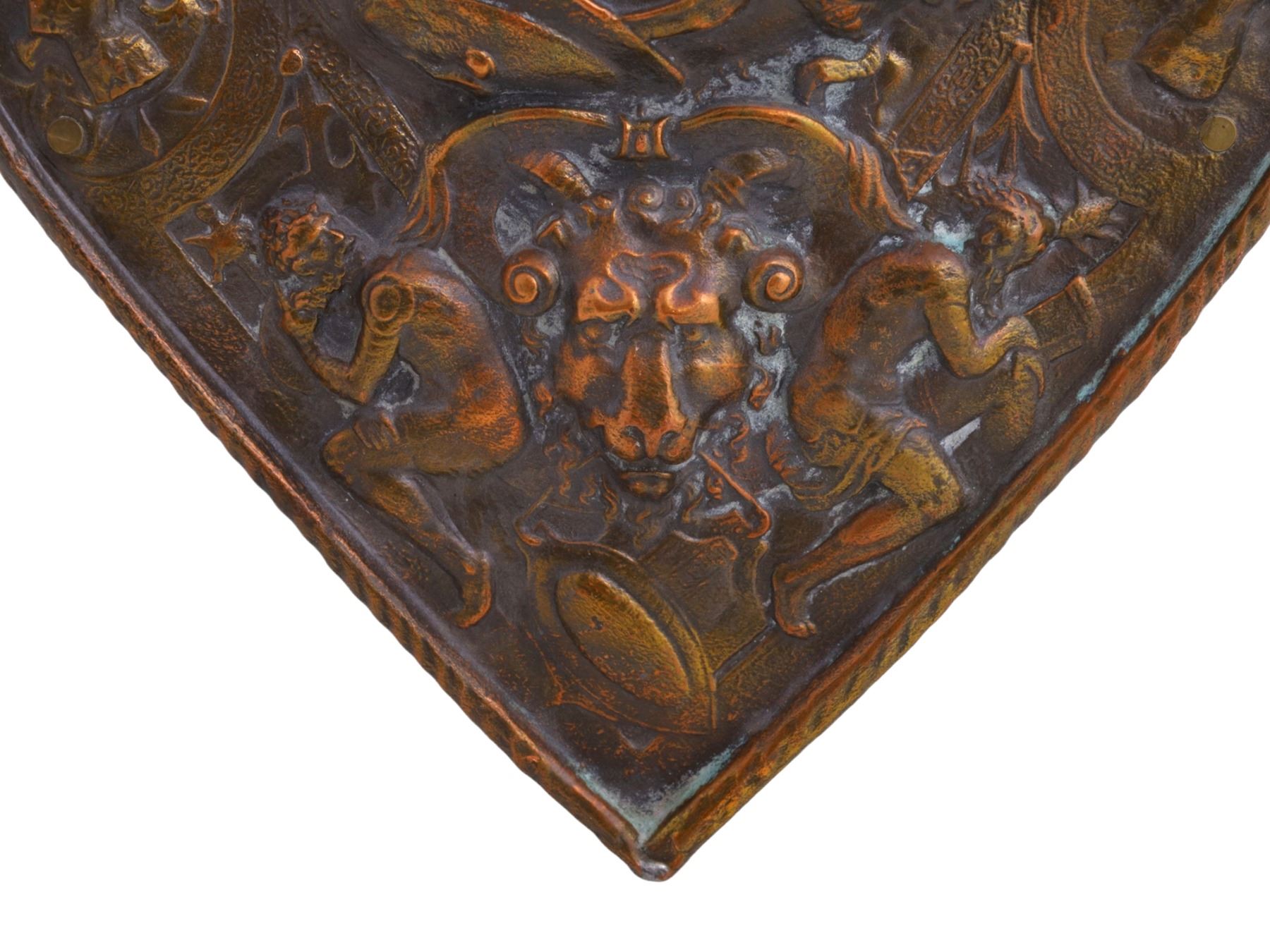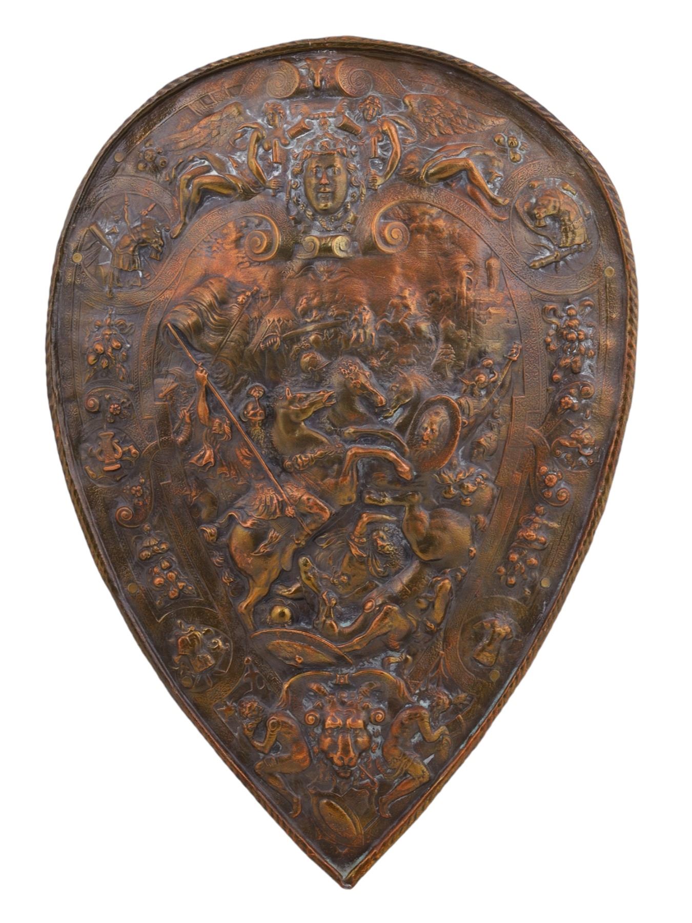 A finely decorated copper shield with repoussé depictions of warriors fighting on horseback and on foot. A town and a military camp can be seen in the background of the scene. The piece is framed with depictions of various pieces of armor and items, as well as a lion and a pair of angels surrounding a large face. The copper bears multiple attachment points on the back for affixing to a wall.