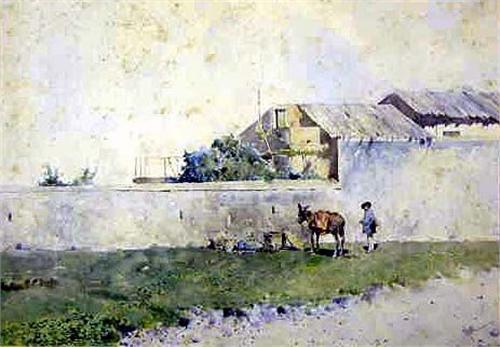 A EUROPEAN WATERCOLOR; Depicting mule, young boy and his belongings Signed LR F.H.M 17"h x 12"w