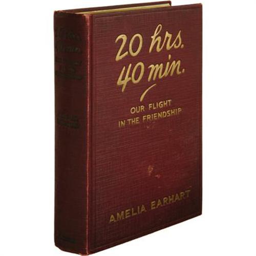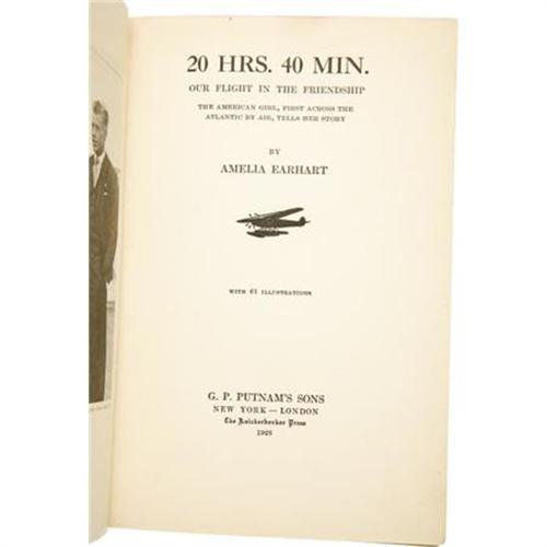 <B>Amelia Earhart: Signed First Edition of <I>20 Hrs. 40 min.: Our Flight in the Friendship</B></I>.</B></I> (New York & London: G.P. Putnam's Sons, 1928), first edition, 314 pages, 61 illustrations, maroon cloth with gilt lettering on the spine and front board, 8vo (5.5" x 8.25"), clear mylar protective cover. Endpapers illustrated with manuscript facsimiles from Earhart's flight diary. Signed "<I>Amelia Earhart</B></I>" on the recto of the frontispiece. This is a handsome, signed, first edition copy of Earhart's first book, a mix of flight log entries from Earhart's first flight across the Atlantic and Earhart's personal biographical sketches of her childhood and early aviation experiences. The book is in about very good condition, with lightly bumped corners, two small spots of rubbing to the front board, not affecting the titling, and minimal edge and spine wear. The gilt titling on the spine shows some sunning. There is light thumb-soiling to the text edges, but the interior text is clean. Binding sound. Previous owner's signature on the half-title page. The book comes housed in a custom quarter leather slipcase with five raised bands & gilt titling on the spine and marbled boards. A rare signed copy of Earhart's first foray into adventure writing, <I>20 Hrs. 40 min.</B></I> was recently named one of the "100 Greatest Adventure Books of All Time" by <I>National Geographic</B></I>.<BR><BR><b>Shipping:</b> Books & Catalogs (<a target="_blank" href="http://www.heritageauctions.com/common/shipping.php">view shipping information</a>)