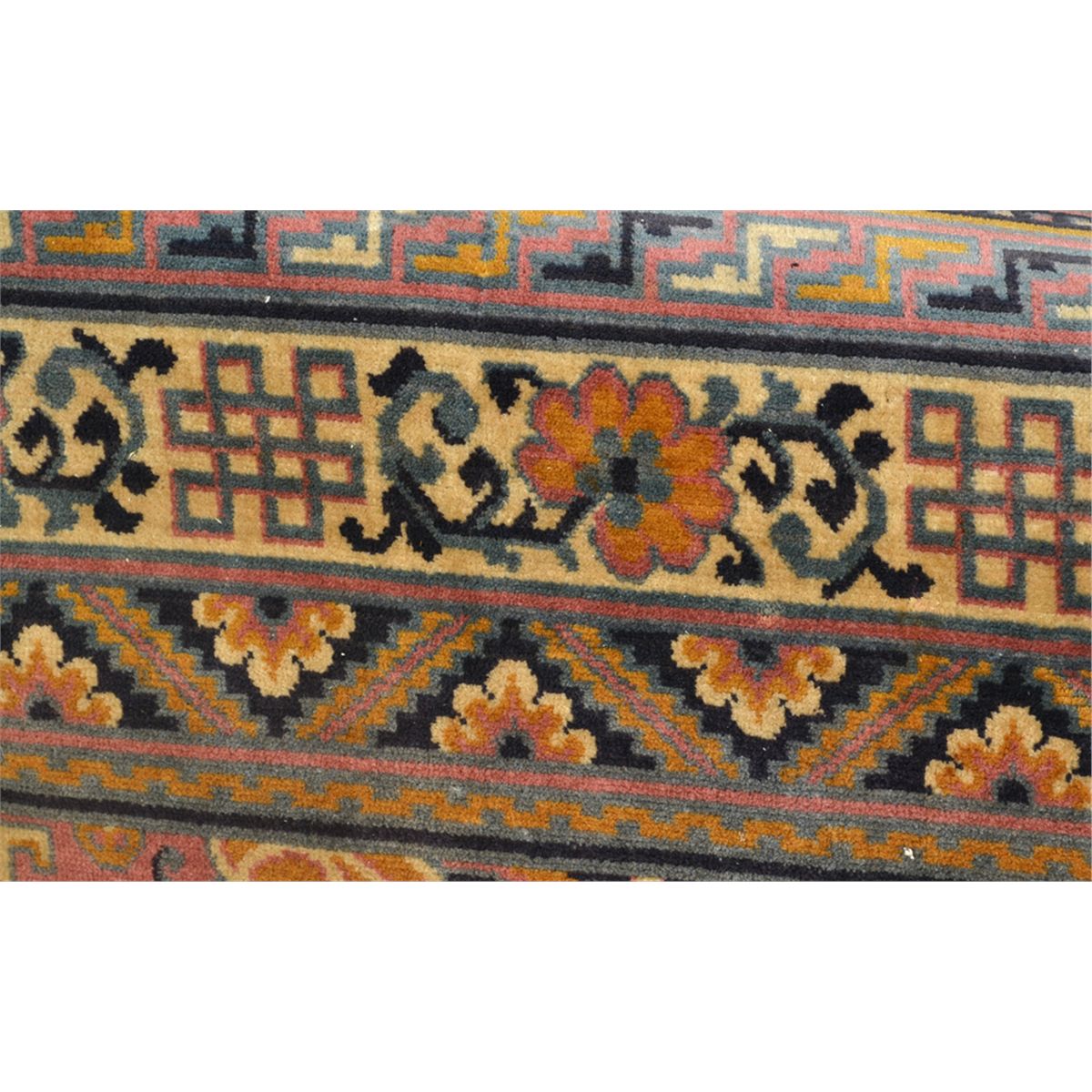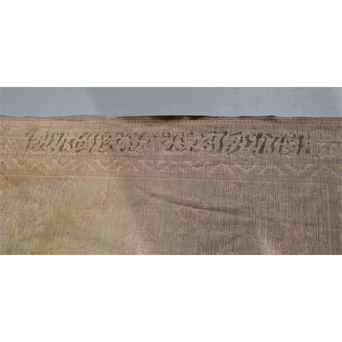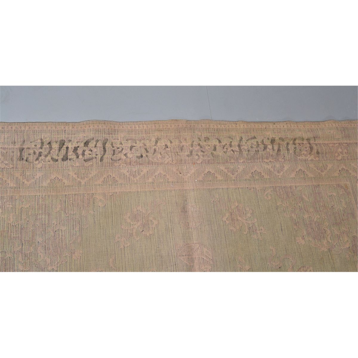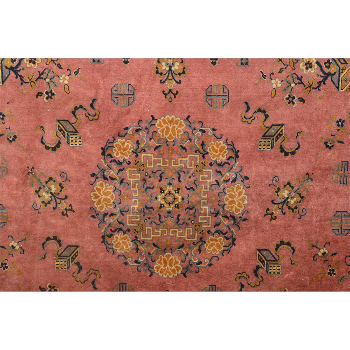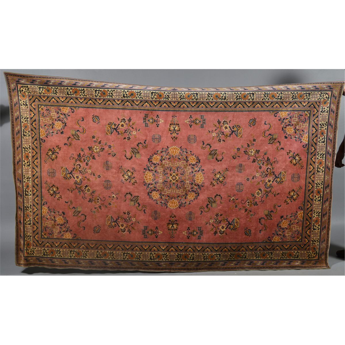 Decorated with centeral medallion of flowers, the remander decorated with symbols, flower baskets and urns in a salmon brown with additional colores of blues, yellows and greens. 95.75" L x 57" W. Circa 1920. Private collection Gregory, MI.