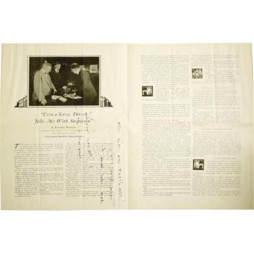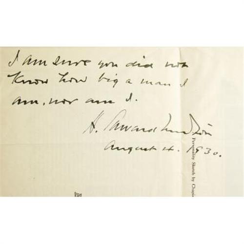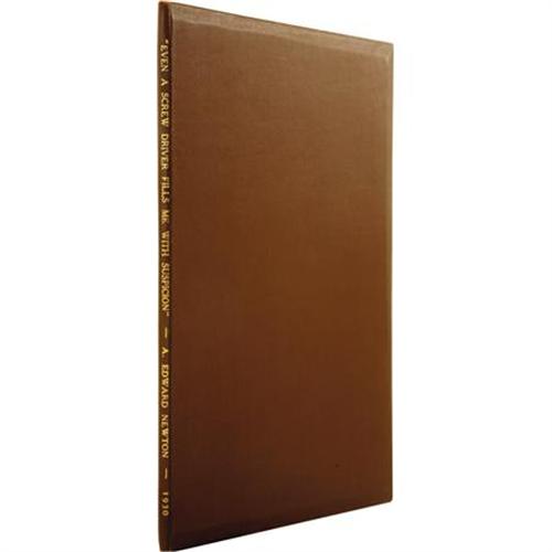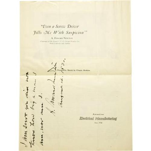 <B>A. Edward Newton: Signed Magazine Article Titled "Even a Screw Driver Fills Me With Suspicion."</B></I> 4 pages, 9" x 12". Inscribed and signed "<I>I am sure you did not know how big a man I am, nor am I. A. Edward Newton August 4, 1930.</B></I>" Newton was a famous man of electricity, and long-time Chairman of the Board for I. T. E. Circuit Breaker Co. He is most renown today as a preeminent author of books on bibliophily. Newton authored a number of books, wrote articles for magazines, gave lectures, and was generally the most well-respected authority on book collecting in his own time. His book <I>The Amenities of Book-Collecting and Kindred Affections</B></I> was one of the most wildly popular publications on book-collecting ever written, and remains one of the most fiercely collected books among bibliophiles. The article presented here is a short "Personality Sketch" of Newton by Chapin Hoskins, reprinted from <I>Electrical Manufacturing.</B></I> Chapin balances his article between Newton's vocation and his avocation, revealing a man deeply devoted to both his work and his books. In Newton's words, as quoted in the article: "My life has always been a singularly duplex affair...One half of it--no, much more, nine-tenths of it--has been hard work, the rest of it has been spent in my library." The article is in fine condition, with the usual folds. It is housed in a tri-fold custom binder with gilt spine lettering.<BR><BR><b>Shipping:</b> Books & Catalogs (<a target="_blank" href="http://www.heritageauctions.com/common/shipping.php">view shipping information</a>)