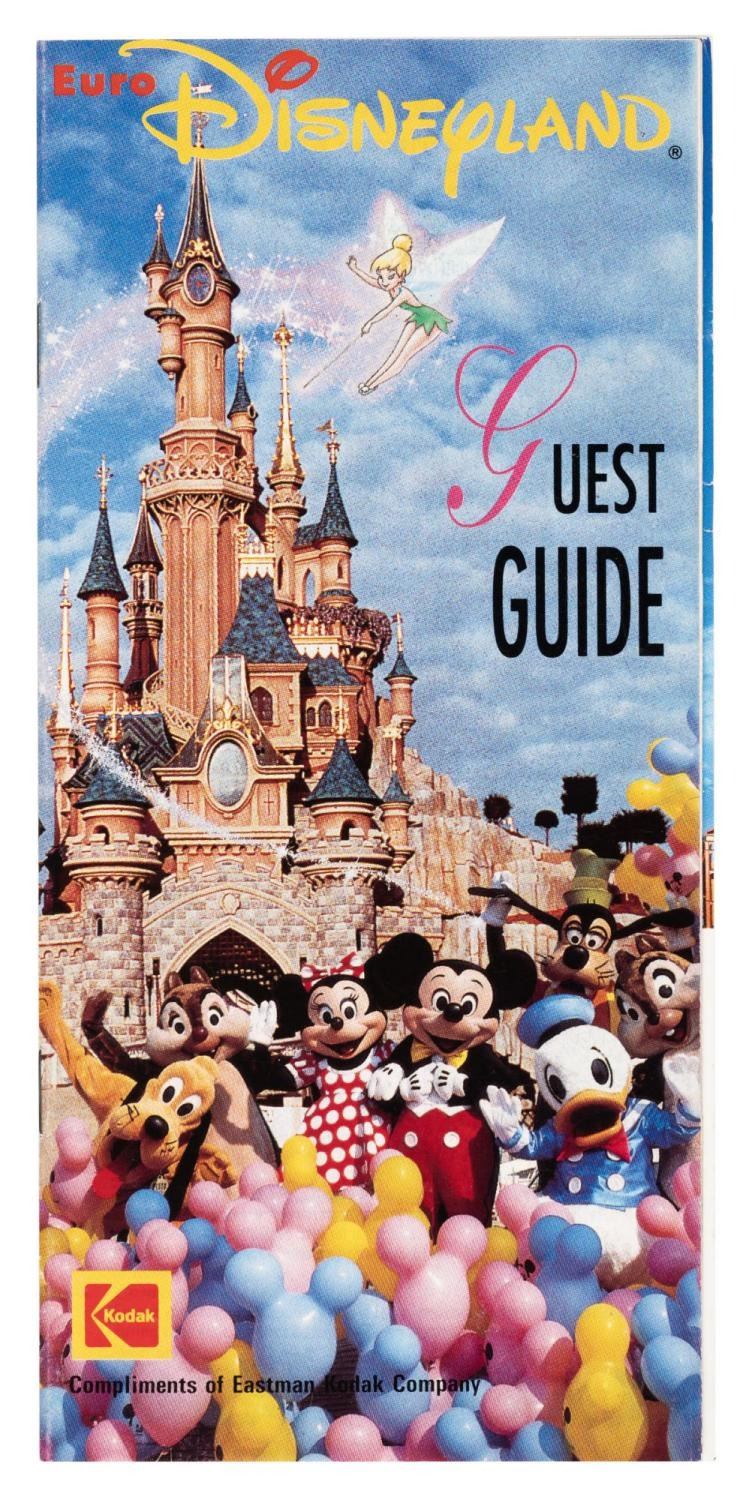 (Euro Disneyland, 1992) A Euro Disneyland Guest guide featuring a map, services, and dining around the Park. Measuring 3.75” x 8”, the guide displays in very good condition with light scuffs and wear.