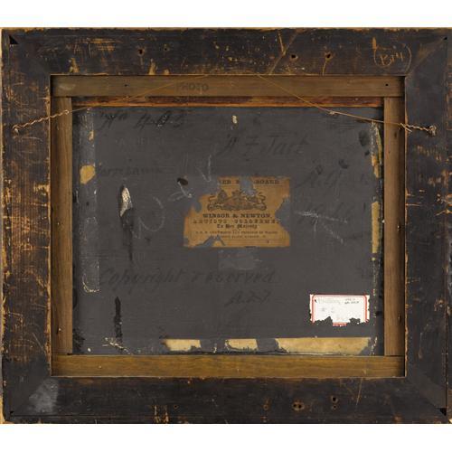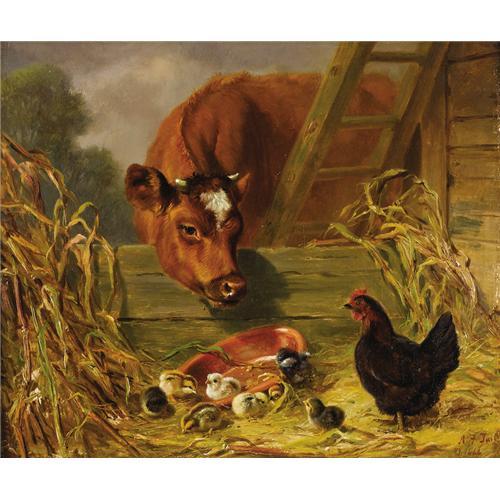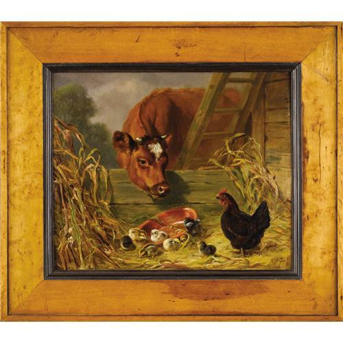 <B>ARTHUR FITZWILLIAM TAIT</B></I> (American 1819-1905)<BR><I>Barnyard Scene,</B></I> 1866<BR>Oil on board<BR>10 x 12 inches (25.4 x 30.48 cm)<BR>Signed and dated lower right in red paint: <I>A. F. Tait / N.Y. 1866</B></I><BR>Inscribed verso: <I>No 493 / A.F. Tait / Morrisania / N.Y. / 1866 / Copyright reserved / A.F.T.,</B></I> with a paper label for Winsor & Newton; and a paper label numbered: <I>Painting #5 / $600.00/ H82.7 / 8A.152A</B></I><BR><BR>Provenance:<BR>Bessie Heard (McKinney, Texas);<BR>Bessie Heard Trust<BR><BR> <B>Condition Report:</B> Normal signs of wear as appropriate with age, with minor frame abrasion and some old varnish on the lower edge, lower right corner and to the chick farthest left.<BR><BR><b>Shipping:</b> Requires 3rd Party Shipping (<a target="_blank" href="http://www.heritageauctions.com/common/shipping.php">view shipping information</a>)