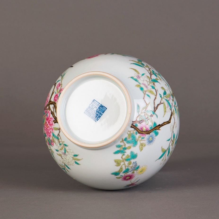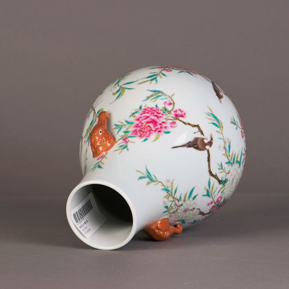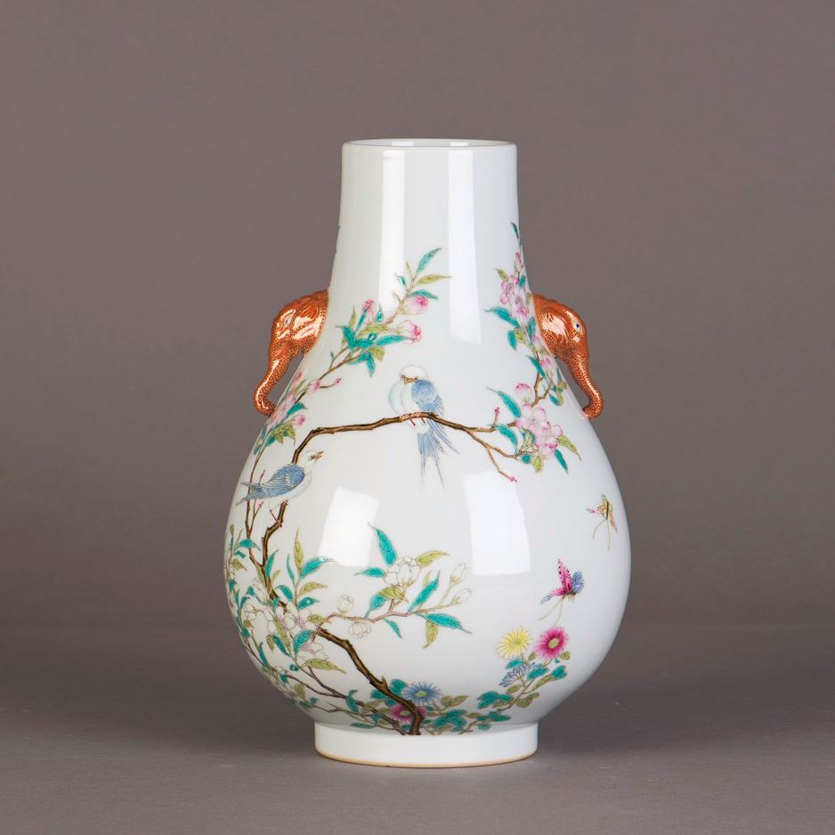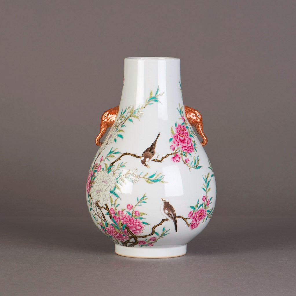 A famille rose porcelain bowl supported on a short foot and a rounded body rising to sloped shoulder and neck, flanked by two handles in elephant shape, avain and floral motif painting on the body, bearing a six-character seal on the base. Height 10" Diameter 6.5"