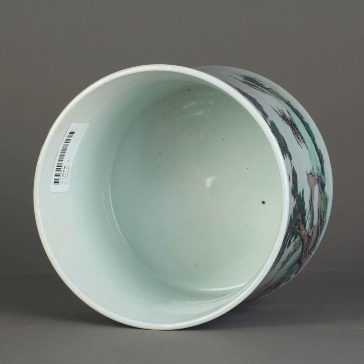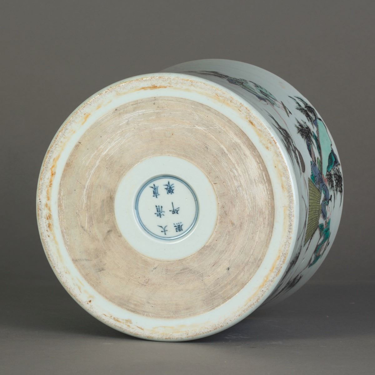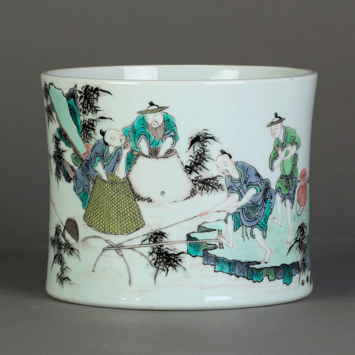 A Chinese famille rose porcelain brush pot, white-glazed with famille rose painting of fisherman enjoying the fun of fishing by the shore, bearing a six-character seal on the base. Height 6.5" Width 8"