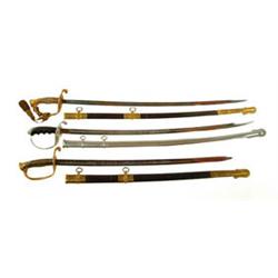 A FAMILY OF SWORDS! PRESENTATION GRADE CIVIL WAR MODEL 1851 U.S.NAVAL OFFICER’S SWORD INSCRIBED TO PAUL H. KENDRICKEN, U.S. NAVY, A LATER NAVAL OFFICER’S SWORD PRESENTED TO KENDRICKEN COMMANDING THE KEARSARGE ASSOCIATION OF NAVAL VETERANS IN 1889 AND A U.S. MODEL 1902 OFFICER’S SABER BELONGING TO KENDRICKEN’S GRANDSON. Two important presentation swords belonging to a Civil War navy engineer and the U.S. Model 1902 Army saber of his grandson, a full legacy of family swords. The first is a Civil War period presentation grade U.S. Model 1851 Naval Officer’s sword. The slightly curved, single edged, wide blade is 28 3/4” long. The blade is exuberantly etched with fouled anchors, trophies, “U.S.N.” and scrollwork. The sword is styled according to regulation with cast brass, gold plated hilt, grip of beautiful gold mesh over wood with triple twisted brass wire wrap. The scabbard is of leather with fancy brass mounts incorporating the regulation square knot on the carrying rings. Both sides of the scabbard mounts are engraved with floral decorations and the drag is engraved with “U.S.N.” On the reverse side of the top mount is the presentation: “Presented to/Paul H. Kendricken/by the/Members of the/St. James Sunday School/September 19, 1862”, also named on top of handguard. A photocopy of a letter accompanies this sword from the members of the St. James Sunday School dated September 19, 1862 presenting the sword to Kendricken. The second sword is a nice, high-grade presentation post-Civil War U.S. Model 1872 Naval Officer’s sword presented by the officers and shipmates of the Kearsarge Naval Veterans’ Association. The sword is a standard regulation model with a 31” single edged blade, 3/4” wide. 75% of the blade surface is covered with etching and etched panel presentations which read: “Presented to Commodore Paul H. Kendricken, commanding Kearsarge Association of Naval Veterans” on one side and “by his brother officers and Shipmates, December 26, 1889” on the reverse. The sword is marked “G.W. Simmons & Co. /Boston” on the ricasso. The hilt is of gilt cast brass according to regulation, cast in high relief. The grip is of sharkskin, triple wire wrapped over wood. The scabbard is of leather with brass furniture. The scabbard mounts are engraved with scrollwork and a fouled anchor and square knot. The sword retains its original gilt cloth sword knot. Accompanying is a letter presenting Kendricken with this sword from the Kearsarge Association, and an additional letter from Kendricken to his grandson, Captain Paul K. Thomas, presenting him with this post Civil War sword in 1912. The third sword is a decorated version of the regulation “sword for all army officers” which was authorized in 1902. The single edged curved blade is 31-1/2” long with etched panels covering 60% of the blade. The etching is profuse with scrolls, the Great Seal of the United States, “U.S.” and floral decoration. The blade is etched with the presentation in a rectangular panel near the ricasso reading: “Capt. Paul K. Thomas/Presented by 1103 Command/C.C.C.” The hilt is of nickeled steel with a three branch knuckle guard, bird’s head pommel and backstrap. The hilt is highly decorated with stars, laurel leaves, and an eagle at the base of the grip. The pommel and backstrap are, likewise, decorated. The grip is of hard rubber and the scabbard nickeled steel. Paul H. Kendricken was born in Galway, Ireland on December 26, 1834. He immigrated to the United States and was employed as a steam fitter. On June 20, 1862 he was appointed Acting Third Assistant Engineer in the U.S. Navy assigned to the U.S.S. Conemaugh a dbl ended side paddle wheel steamer which served in both the Atlantic and Gulf Blockading Squadrons. On November 6, 1863 he was promoted to Acting Second Assistant Engineer. Toward the end of the war he served aboard the U.S.S. Circassian, an iron screw steamer serving the Gulf Blockading Squadron and U.S.S. Nausett a Casco-Class light draft Monitor. Following the close of war he returned to service on the U.S.S. Conemaugh and was honorably discharged on September 3, 1866. The sword is accompanied by Kendricken’s pension record along with some information on the ships he served. CONDITION: Excellent, the Civil War presentation sword retains much of its factory finish. The blade is very fine with frosty etching. The brass furniture has a mellow patina and the scabbard is very good. The post Civil War naval officer’s sword is equally as nice. The U.S. Model 1902 sword belonging to Capt. Thomas is bright with slight signs of age and minor wear. 4-53183 CW2