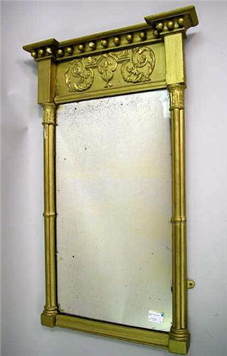 A FEDERAL CARVED GILTWOOD LOOKING GLASS; Probably American, cracks, losses, repairs and restorations 31 1/4"h x 19 1/2"w