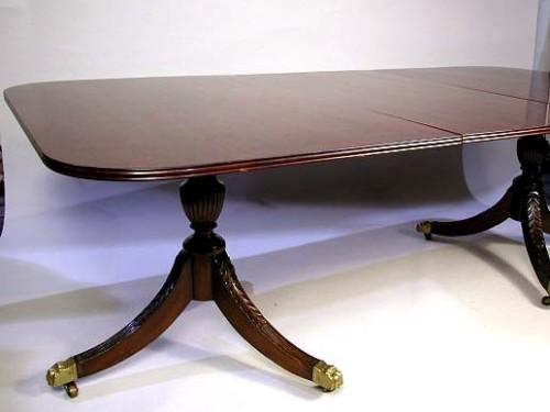 A FEDERAL CARVED MAHOGANY TWO-PEDESTAL DINING TABLE; New York, with rounded ends and reeded leaves on a reeded urn-form support, acanthus-carved legs, and brass paw caps and casters 29 1/2"h x 47 1/4"w x 7'4 1/2"l