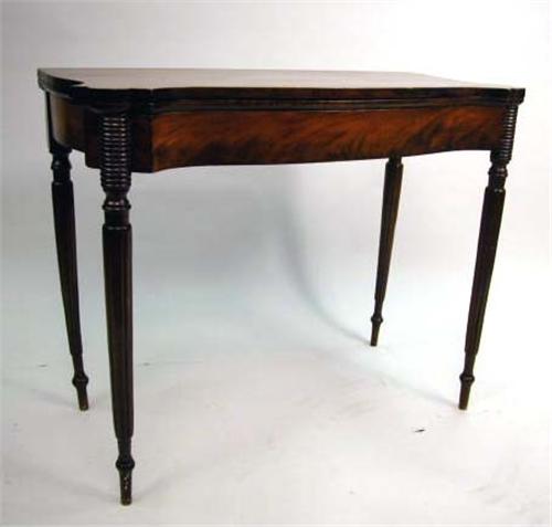 A FEDERAL CHERRYWOOD AND MAHOGANY VENEERED GAMES TABLE; New England, probably Massachusetts, the serpentine front top with outset corners above a similarly shaped frieze, continuing to turned and tapered reeded legs ending on peg feet 28 1/2"h x 35"w x 17 1/4"l