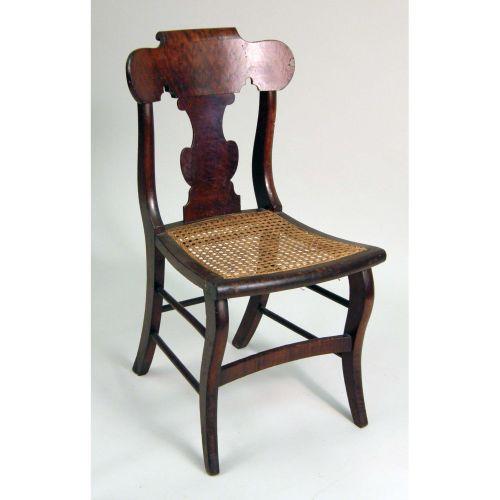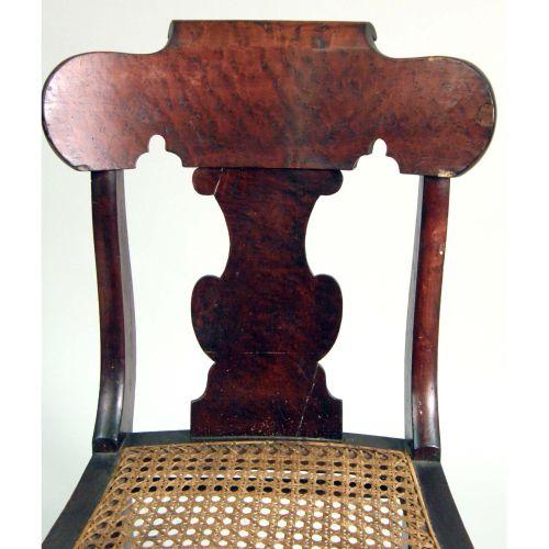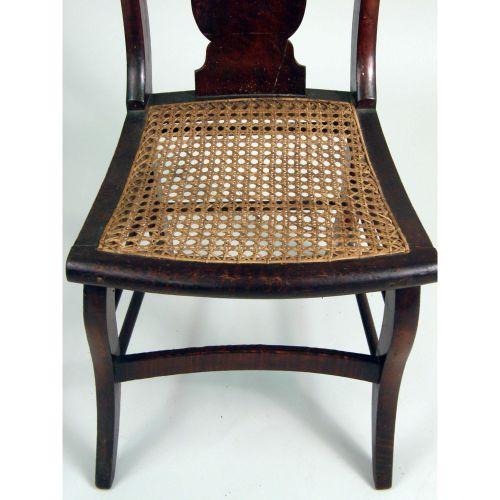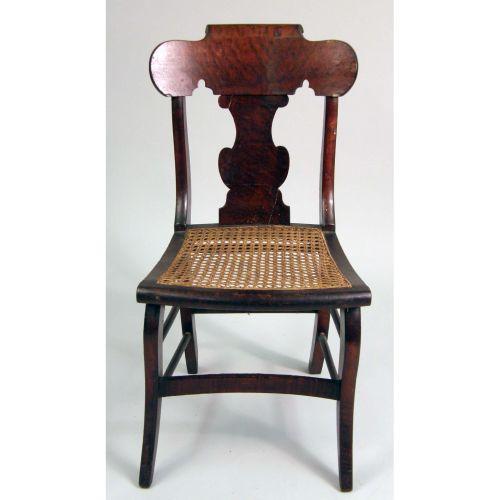 A FEDERAL FIGURED-MAPLE CANE-SEAT SIDE CHAIR<BR><BR>New England, with cracks and repaired breaks. 34" high.