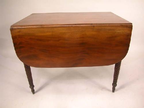 A FEDERAL INLAID AND CARVED MAHOGANY DROP LEAF TABLE; New York, with D-shaped leaves on spirally reeded legs ending in brass ball caps, 24 1/2"H x 37"W x 35"D (repairs)