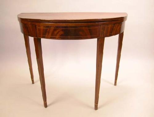 A FEDERAL INLAID MAHOGANY DEMILUNE GAMES TABLE; Mid-Atlantic states, with a d-shaped top and conforming frieze on square tapering legs 29 1/4"h x 37"w x 18"d losses