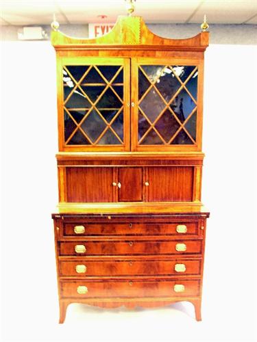 A FEDERAL INLAID MAHOGANY DESK AND BOOKCASE; Massachusetts, in three parts, with a shaped cornice and brass finials above glazed doors, the tambour mid-section opening to pigeonholes and drawers centering a prospect door, the base with a hinged writing flap, four drawers and tall French feet,, may retain original brass hardware, minor losses and patches to the veneer, top and bottom possibly married, 7'4"h x 41"w x19 1/2"d