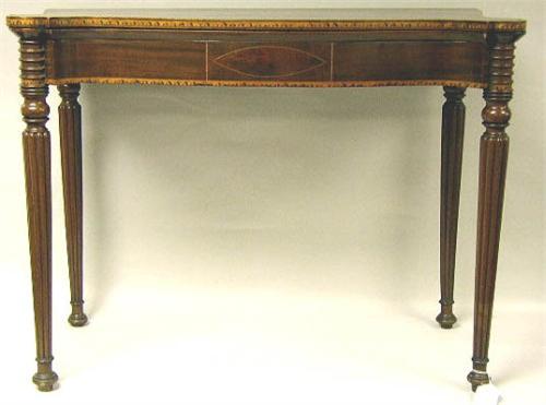 A FEDERAL INLAID MAHOGANY SERPENTINE-FRONT GAMES TABLE; Massachusetts, the serpentine shaped top with outset corners above a lozenge and lunette inlaid frieze, ending on tapering reeded legs (losses to feet) 29"h x 37"w x 17 3/4"d