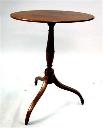 A FEDERAL LINE-INLAID MAHOGANY CANDLESTAND; New England, the oval top tilting above a tapering baluster-form standard ending on line-inlaid "spider-legs" and spade feet (lacks spring lock and screwed shut) 29"h x 14 3/4"w x 22"l