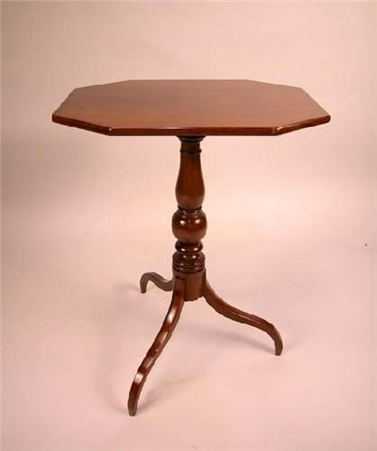 A FEDERAL MAHOGANY OCTAGONAL CANDELSTAND; New England, the hinged top above a turned standard and spider legs 29 1/2"h x 15 3/4"w x 21 1/2"d repairs