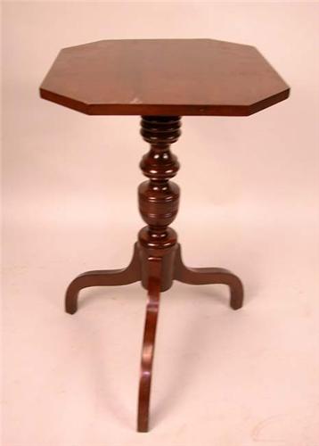 A FEDERAL MAHOGANY OCTAGONAL TILT-TOP CANDLESTAND; American, the shaped top on a turned standard and spider legs, 28"H x 17"W x 18"D (repairs).
